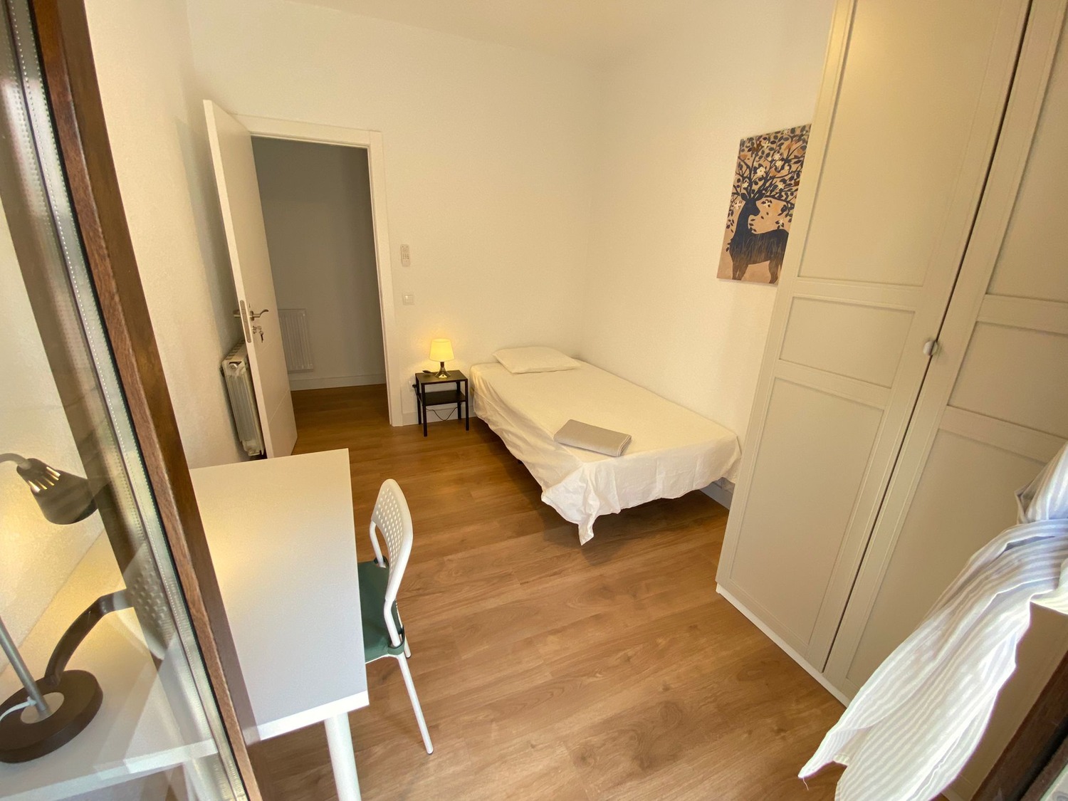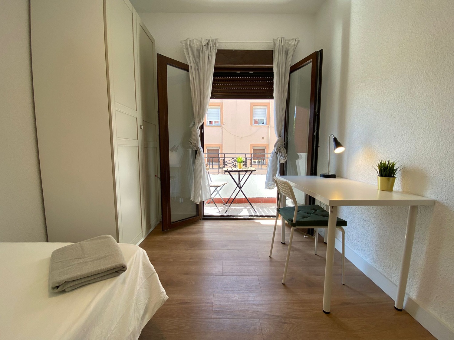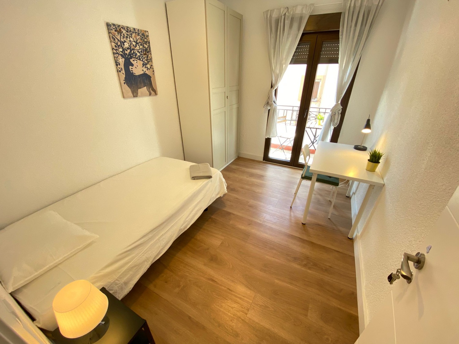 Estupenda habitación privada en alojamiento de estudiantes reformado en 2022. Alquilamos esta habitación privada, perfectamente acondicionada y con iluminación natural, con una superficie aproximada de 10m2. Para las horas de estudio, cuenta con un escritorio cómodo con flexo, cajones y un espacio de almacenaje, y una silla de conferencia. El mobiliario se completa con un armario de 1,05m —en cuyo interior incluye una barra para las perchas—, una mesilla de noche y lámpara de techo, la cama de ancho 1.05 m. Se ha equipado adicionalmente con enchufes con puerto USB, ventilador de techo con mando a distancia y calefacción por gas natural.