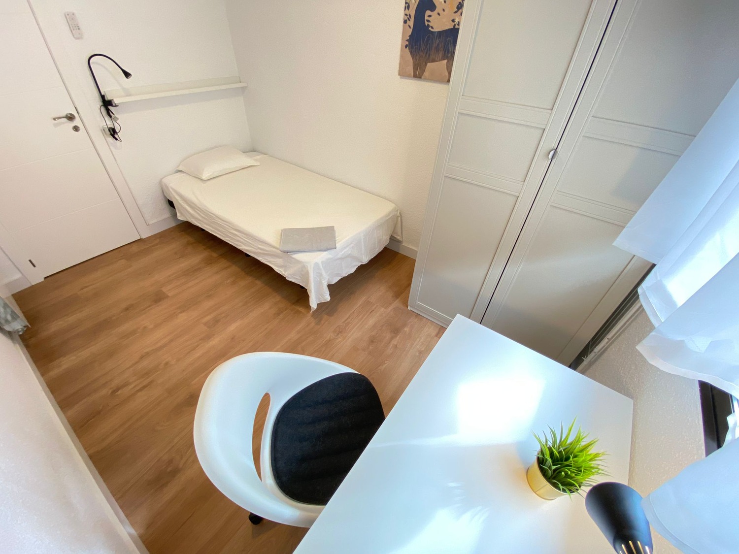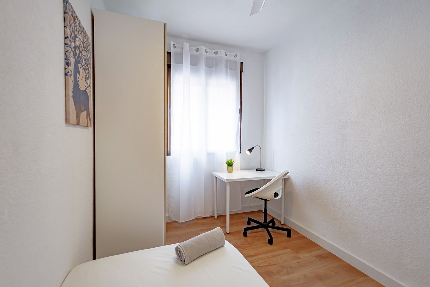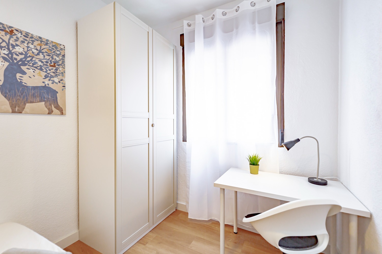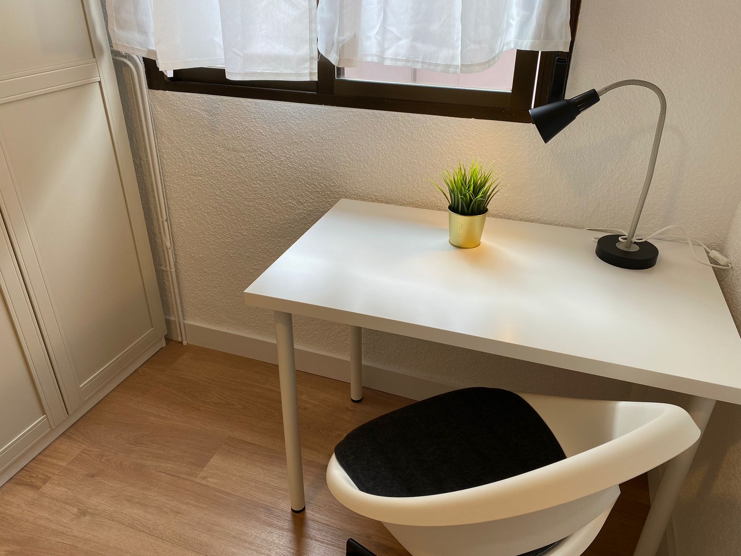 Estupenda habitación privada en alojamiento de estudiantes reformado en 2022. Alquilamos esta habitación privada, perfectamente acondicionada y con iluminación natural, con una superficie aproximada de 8m2. Para las horas de estudio, cuenta con un escritorio cómodo con flexo y una silla de conferencia. El mobiliario se completa con un armario de 1,05m —en cuyo interior incluye una barra para las perchas—, una mesilla de noche y lámpara de techo, la cama de ancho 1.05 m. Se ha equipado adicionalmente con enchufes con puerto USB, ventilador de techo con mando a distancia y calefacción por gas natural.