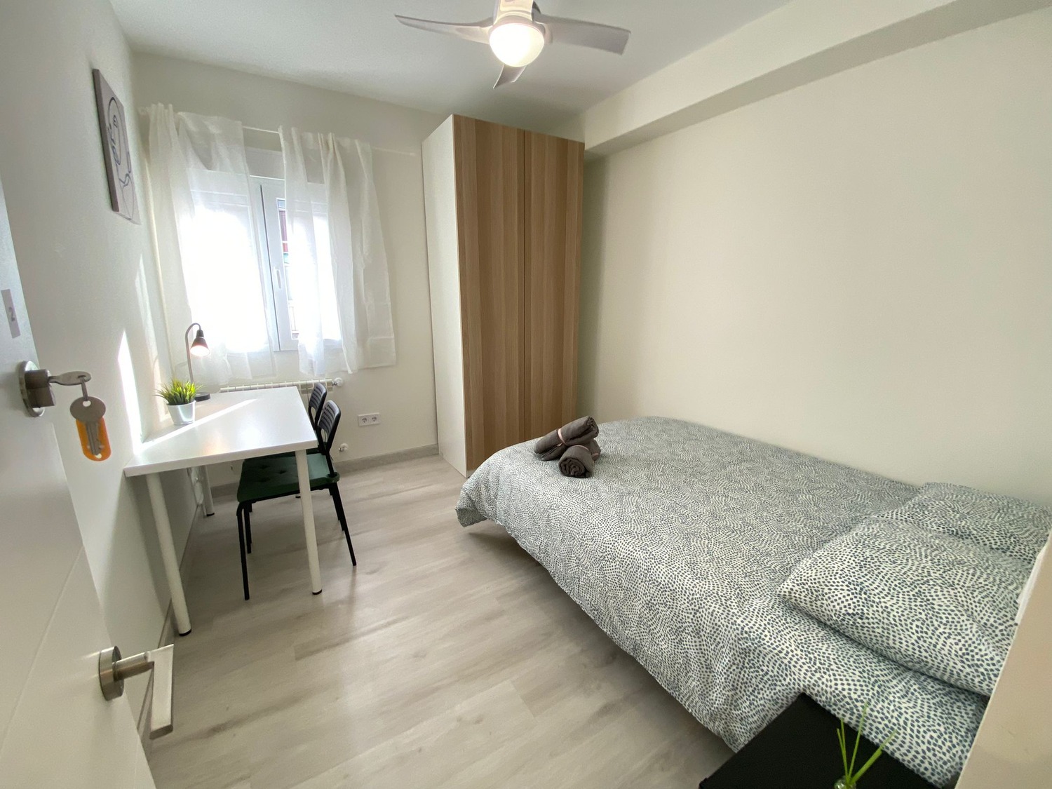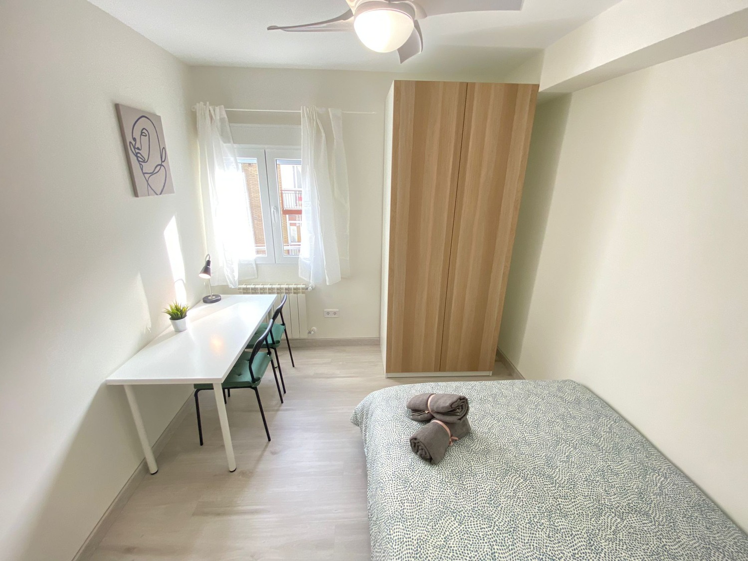 Capital Rooms alquila esta habitación en piso compartido zona comercial de Calle Alcalá. Ubicado Calle Amos de Escalante 12. Alquilamos esta habitación privada DOBLE, perfectamente acondicionada y con iluminación natural, con una superficie aproximada de 12m2. Cuenta con un escritorio cómodo con flexo y dos sillas. El mobiliario se completa con un armario —en cuyo interior incluye una barra para las perchas— mesilla de noche, ventilador de techo con mando a distancia y calefacción por gas natural, la cama de ancho de 1,35 m. La vivienda cuenta con las siguientes zonas comunes: una cocina, equipada con vitrocerámica y campana, una amplia zona común con 2 barras para desayunar o almorzar, microondas y frigorífico. Cada habitación tiene un menaje propio (cubertería completa de uso exclusivo para cada huésped). Posee 1 baño completo con plato de ducha de cómodo acceso desde cualquier habitación y dotado de excelentes calidades. Limpieza dos veces al mes de las zonas comunes. Wifi de alta velocidad. La casa cuenta con lavadora propia. Puedes disfrutar de su inmejorable ubicación, provista de todo tipo de servicios: centro comercial Alcalá Norte, varios supermercados, restauración, bancos, centro de salud y farmacias, etc. A 130 metros de les estación de Metro Pueblo Nuevo, Línea 7, (COLOR NARANJA) y a sólo 6 minutos a pie de la estación de metro Ciudad Lineal, Línea 5 (COLOR VERDE). La zona, además, goza de varias líneas de autobús en las proximidades. Disfrute de esta estancia acogedora, con una excelente convivencia controlada por profesionales.