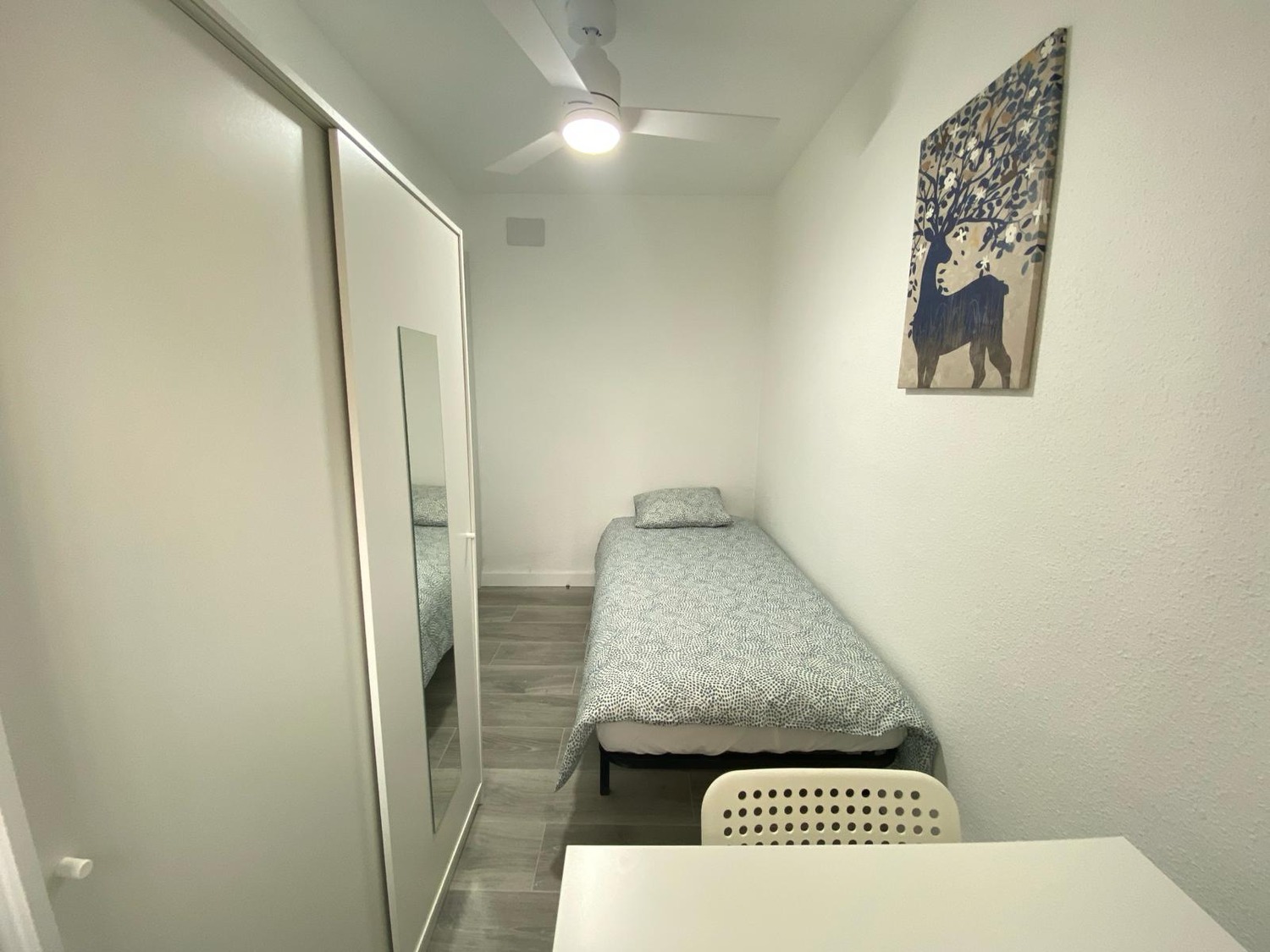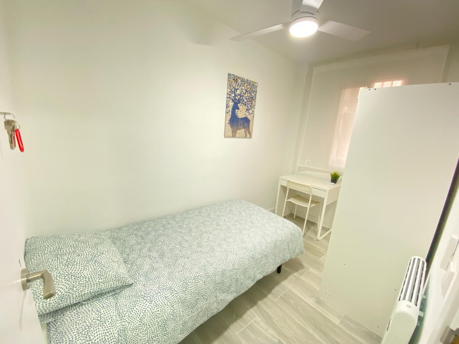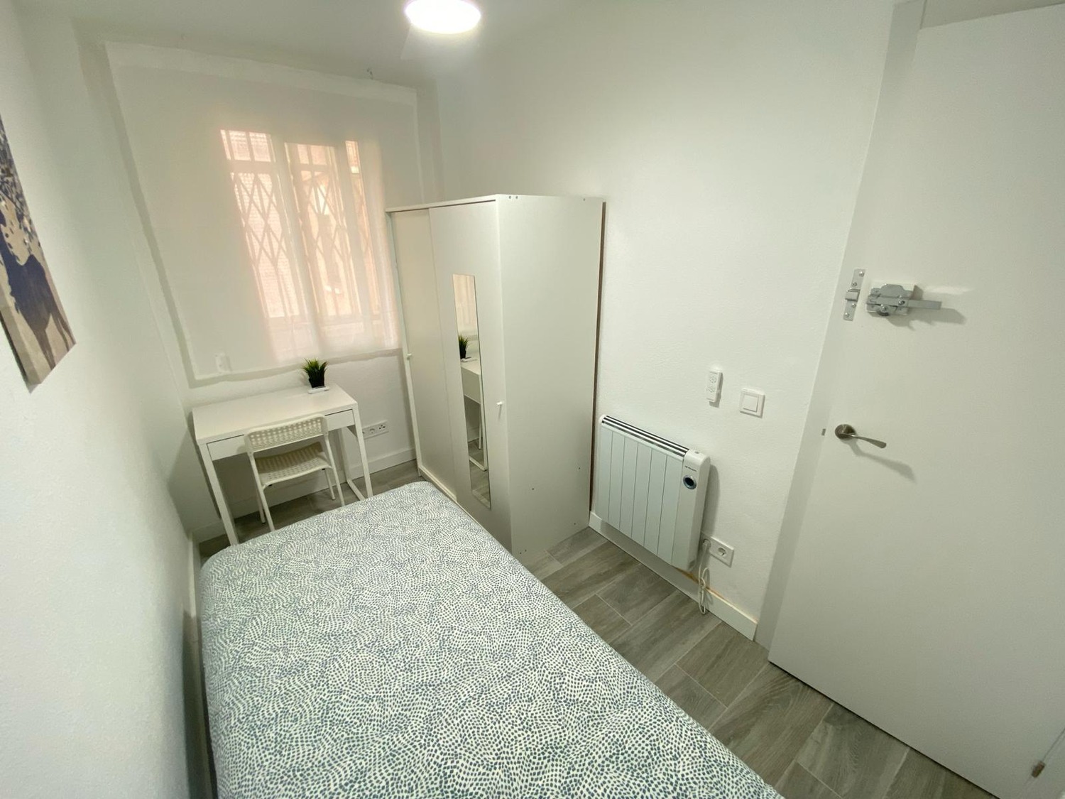 Tu nuevo rincón acogedor te espera, equipado con todo lo necesario: cama individual 90cm, armario con espejo, escritorio y silla para tus horas de trabajo o estudio y ventana para bañarte en luz natural. Disfruta del equilibrio perfecto entre frescura y calidez, ventilador de techo con mando a distancia y calefacción eléctrica. Además, te ofrecemos acceso a zonas comunes con cocina completa, wifi de alta velocidad y baño completo compartido, todo mantenimiento con limpieza regular, a estrenar. Un espacio práctico y confortable, diseñado para tu bienestar.