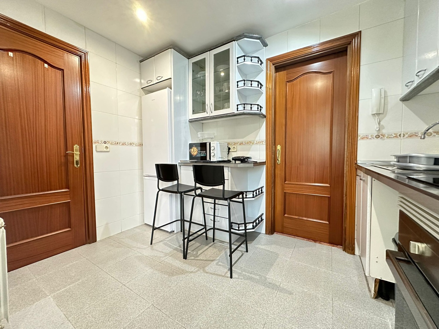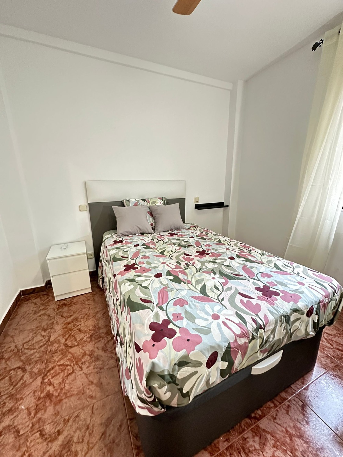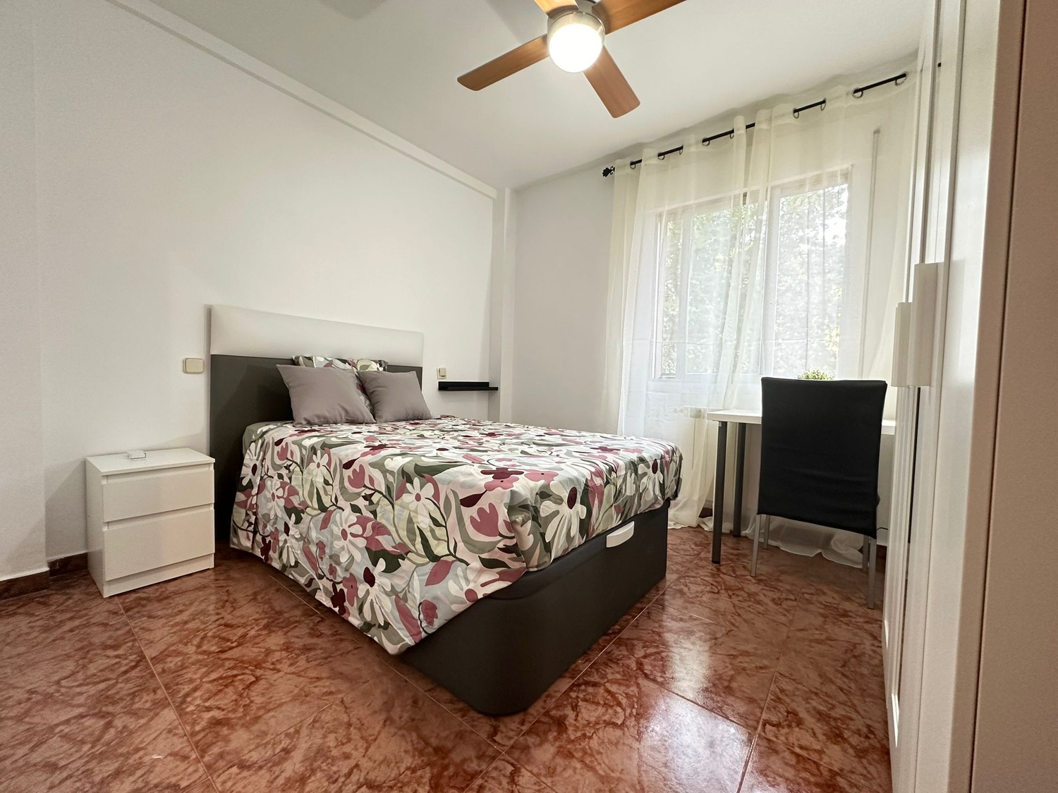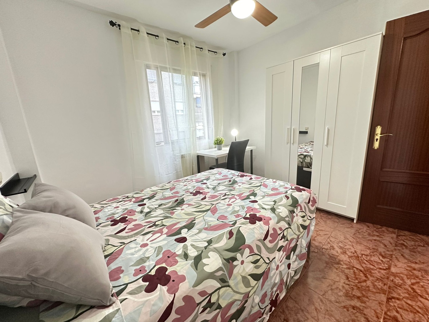 La habitación es individual con cama doble, espaciosa y luminosa, equipada con un amplio armario y un escritorio ideal para tus días de trabajo. Cuenta con ventilador de techo y calefacción central. En cuanto a las zonas comunes no encontramos con una Cocina completamente equipada con vitrocerámica, nevera, horno microondas, lugar para comer y espacio de almacenamiento, ventilador de techo y por otro lado un Baño compartido