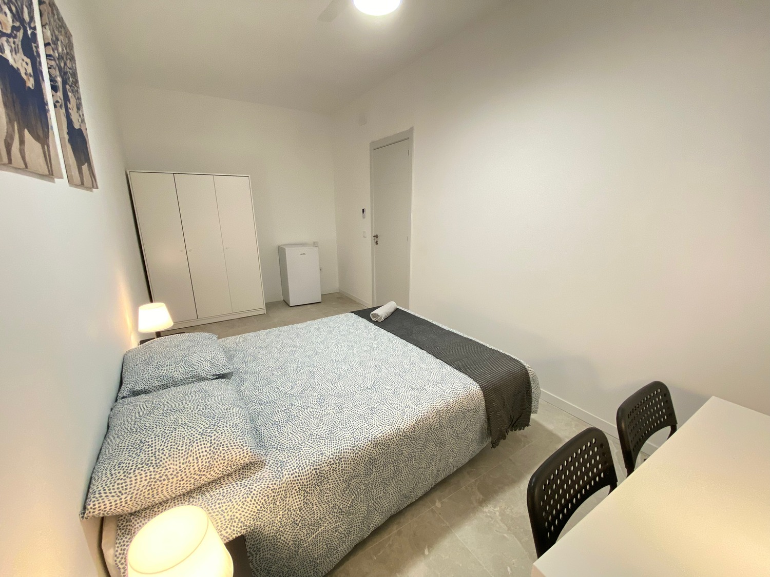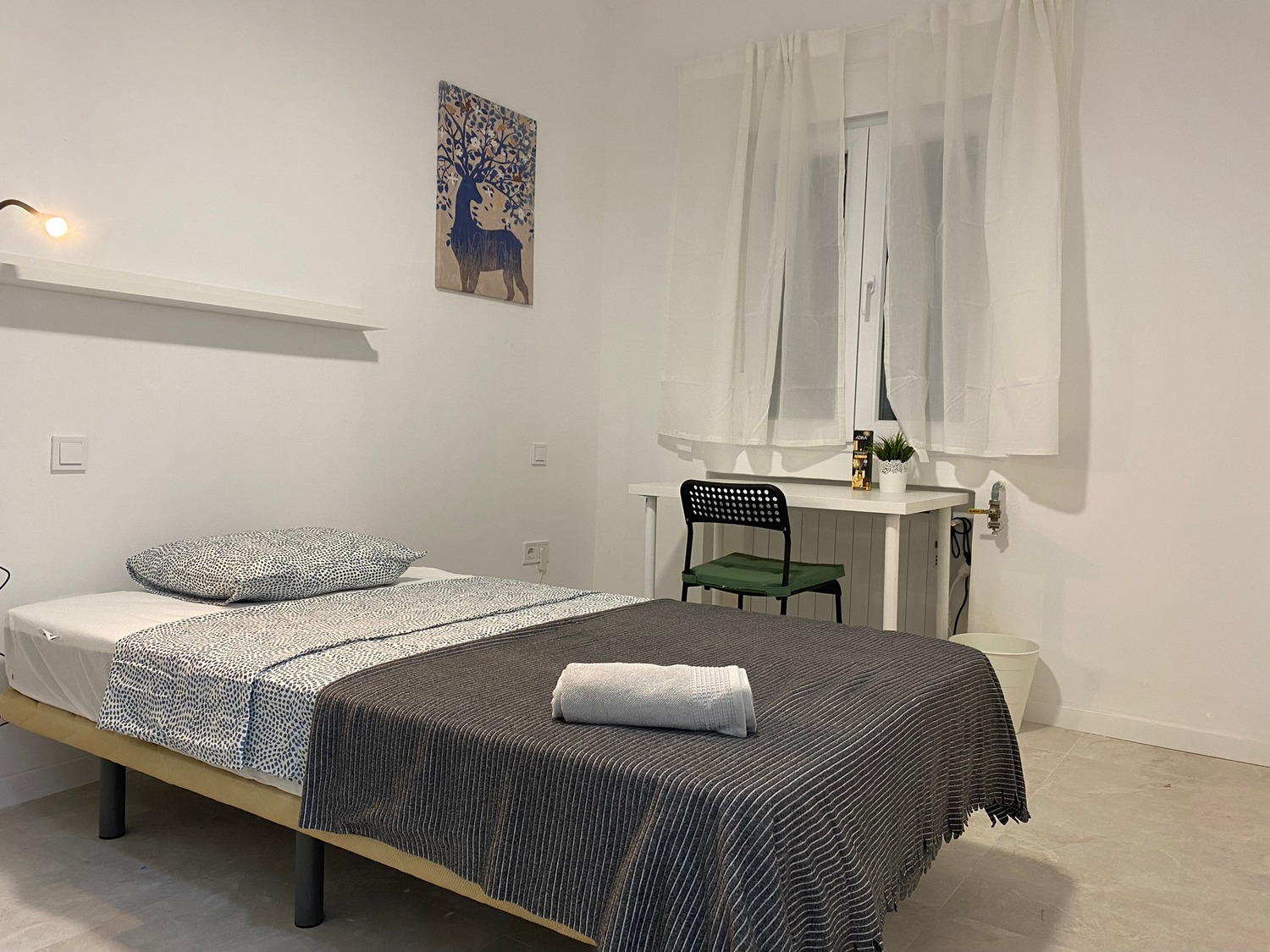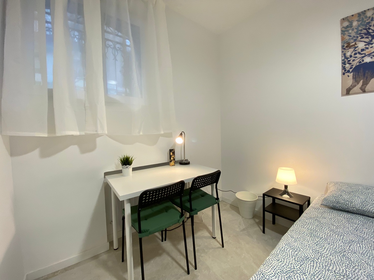 Habitación privada, luminosa y perfectamente equipada, con los siguientes complementos: 1 cama de 1.35 m con almohada, juego de sábanas y edredón, 2 mesitas de noche con lámpara, armario, escritorio con dos sillas, frigorífico privado calefacción eléctrica.