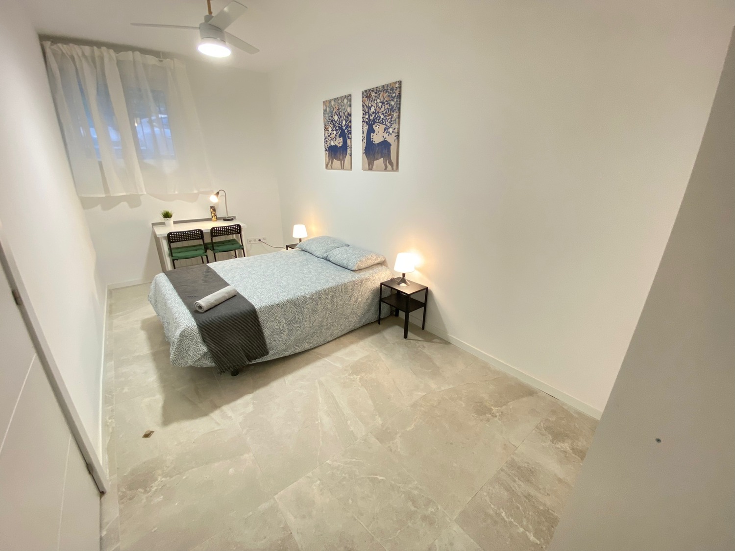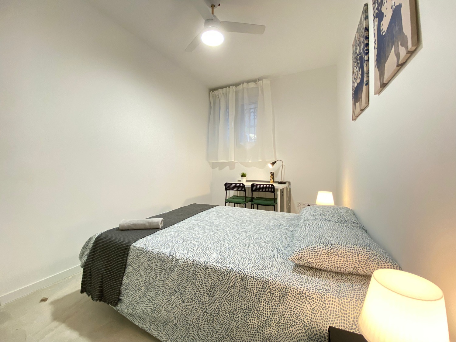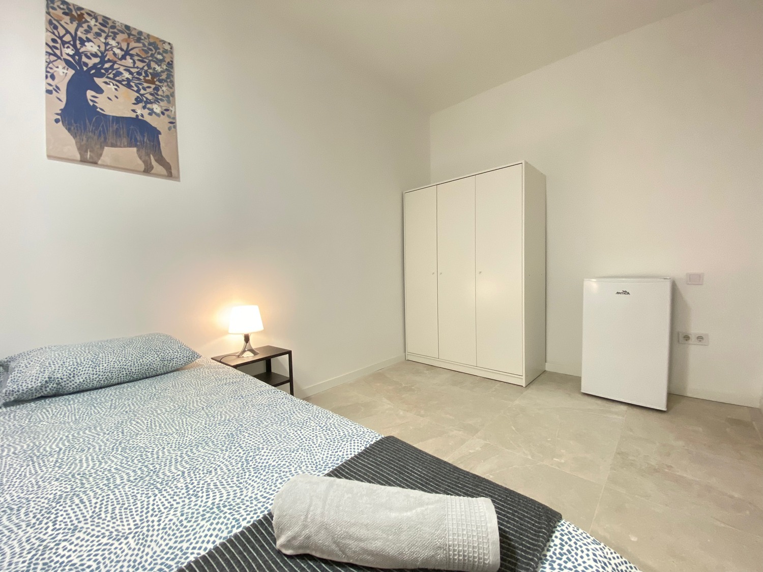 Habitación privada, luminosa y perfectamente equipada, con los siguientes complementos: 1 cama de 1.35 m con almohada, juego de sábanas y edredón, 2 mesitas de noche con lámpara, armario, escritorio con dos sillas, frigorífico privado calefacción eléctrica.