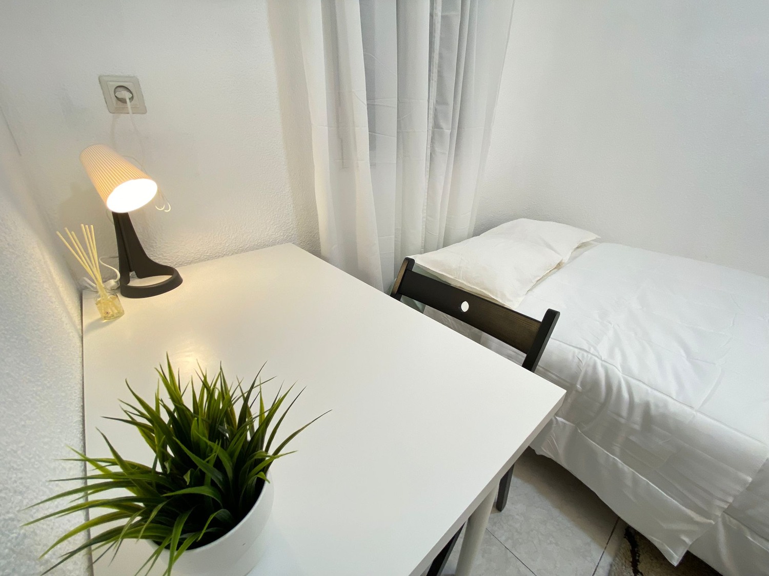 La habitación es interior y está perfectamente equipada, con los siguientes complementos: 1 cama de 1,35 m con almohada, juego de sábanas y edredón, mesita de noche con lámpara, armario, escritorio con silla, calefacción eléctrica.