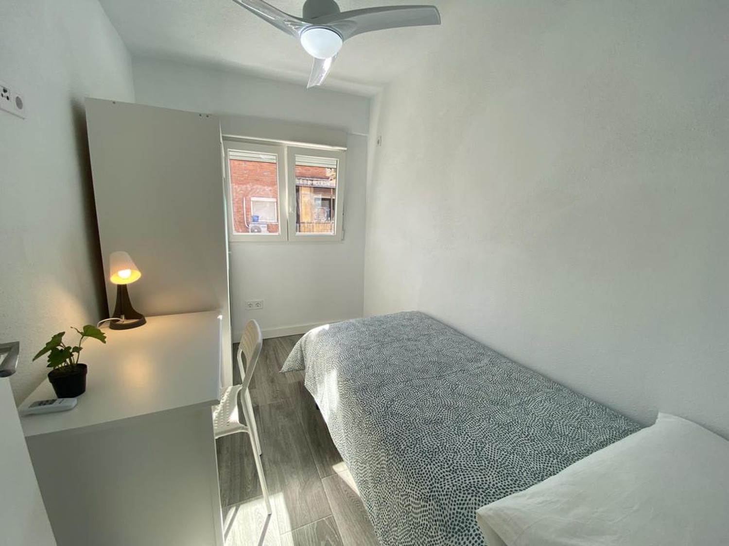 Alquilamos esta habitación privada INDIVIDUAL, perfectamente acondicionada y con iluminación natural, con una superficie aproximada de 15m2. Cuenta con un escritorio cómodo y una silla. El mobiliario se completa con un armario —en cuyo interior incluye una barra para las perchas— ventilador de techo con mando a distancia y calefacción por eléctrica, la cama de ancho de 1,35 m.