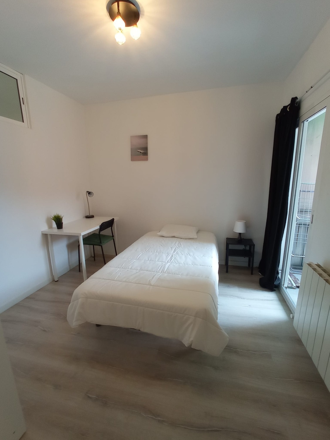 Habitación con terraza, muy luminosa. Está perfectamente equipada, con los siguientes complementos: cama de 1.35 m con almohada, ropa de cama al completo, edredón, mesita de noche con lámpara, armario, escritorio con silla, calefacción por gas natural.