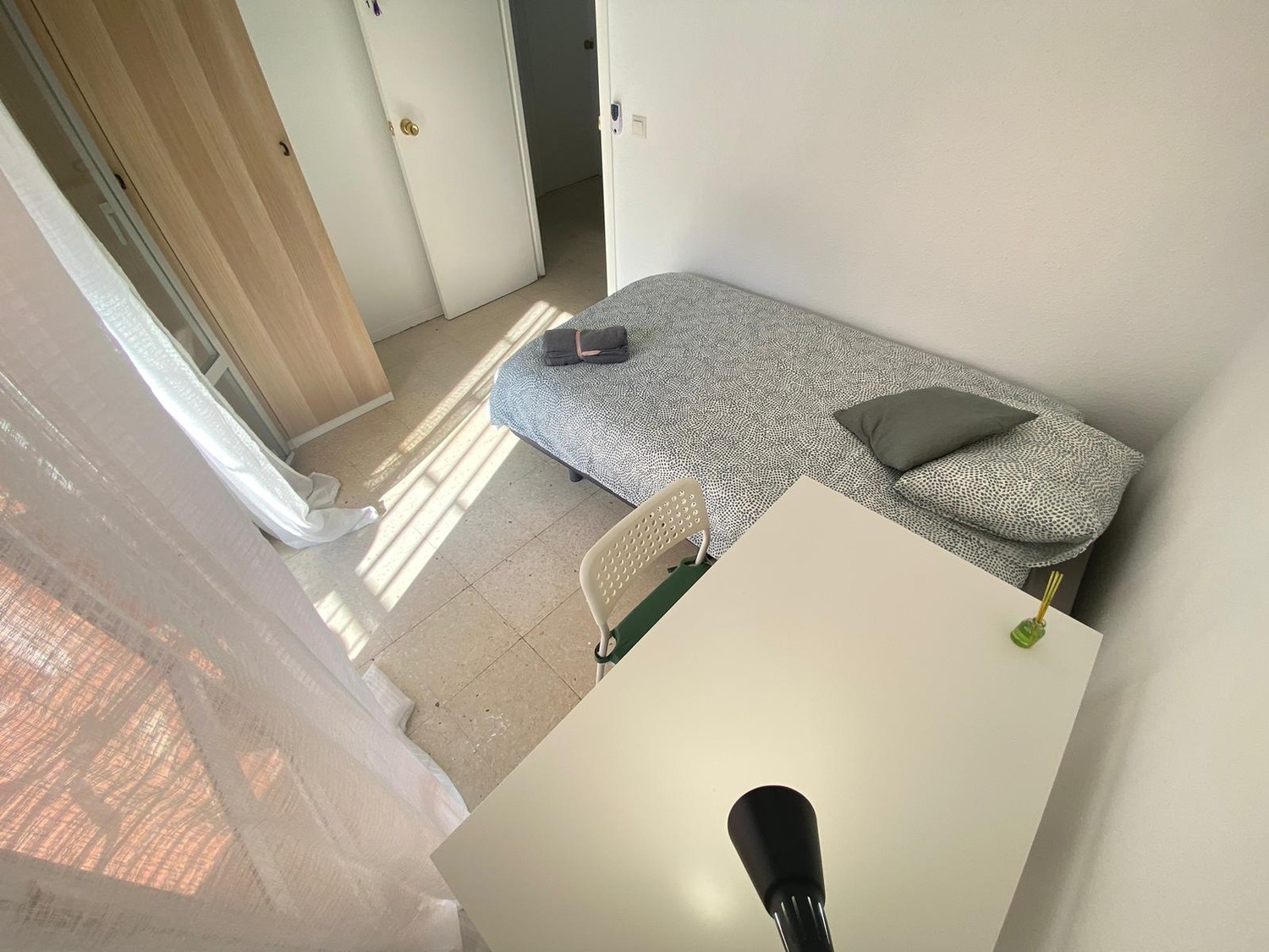 En la publicación podemos apreciar esta hermosa habitación INDIVIDUAL es exterior, luminosa y está perfectamente equipada con los siguientes complementos: 1 cama de 1,05 m con almohadas, juego de sábanas, toalla y edredón, escritorio de trabajo o estudio, balda con lámpara, varios enchufes y un espacioso armario, calefacción individual eléctrica, terraza con buenos cerramientos y ventilador de techo.
