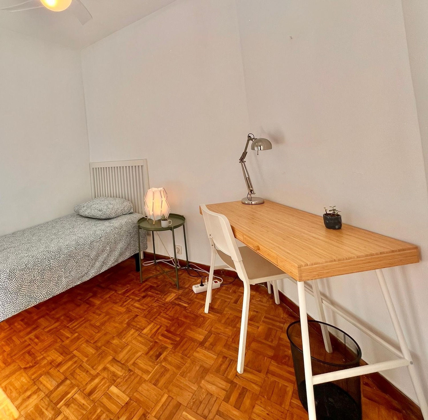 La habitación es luminosa y bien ventilada, equipada con mobiliario moderno y funcional, incluyendo un espacio de estudio con escritorio y silla, así como un amplio armario. El piso compartido cuenta con una cocina totalmente equipada con electrodomésticos modernos, una sala de estar acogedora y confortable. Además, ofrece conexión a internet de alta velocidad y servicio de limpieza en las áreas comunes. Limpieza 2 veces por semana de las zonas comunes y lavadora propia.