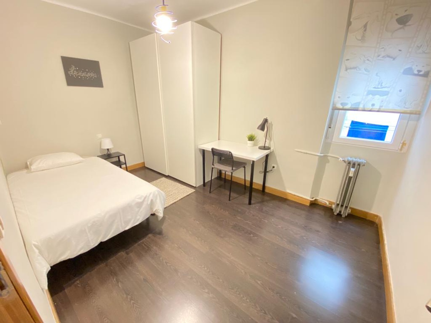 La habitación es muy luminosa y está perfectamente equipada, con los siguientes complementos: 1 cama de 0.90 m con almohada, juego de sábanas y edredón, mesitas de noche con lámpara, armario con espejo, escritorio con silla, perchero de pared, calefacción eléctrica.