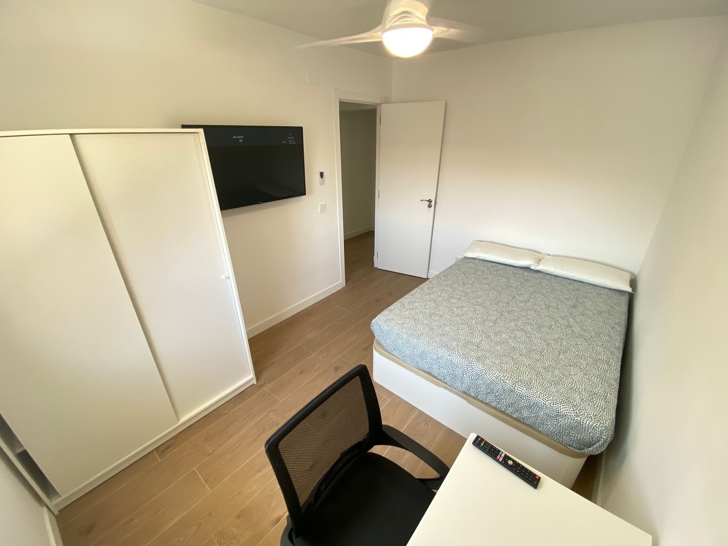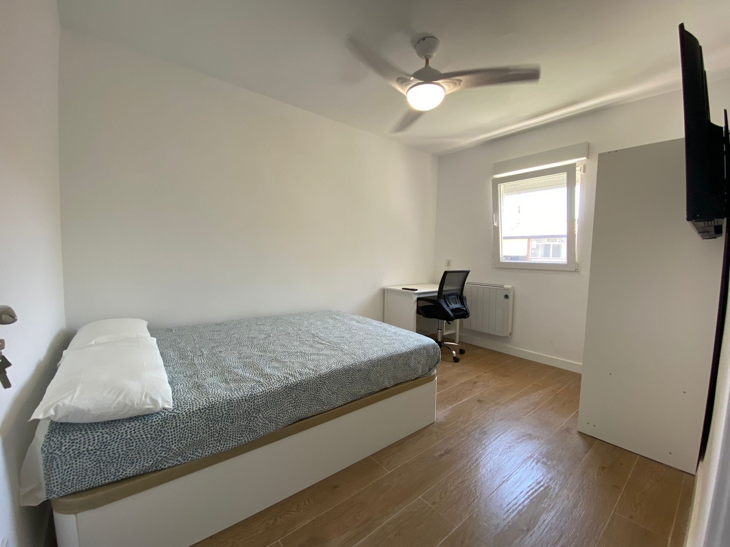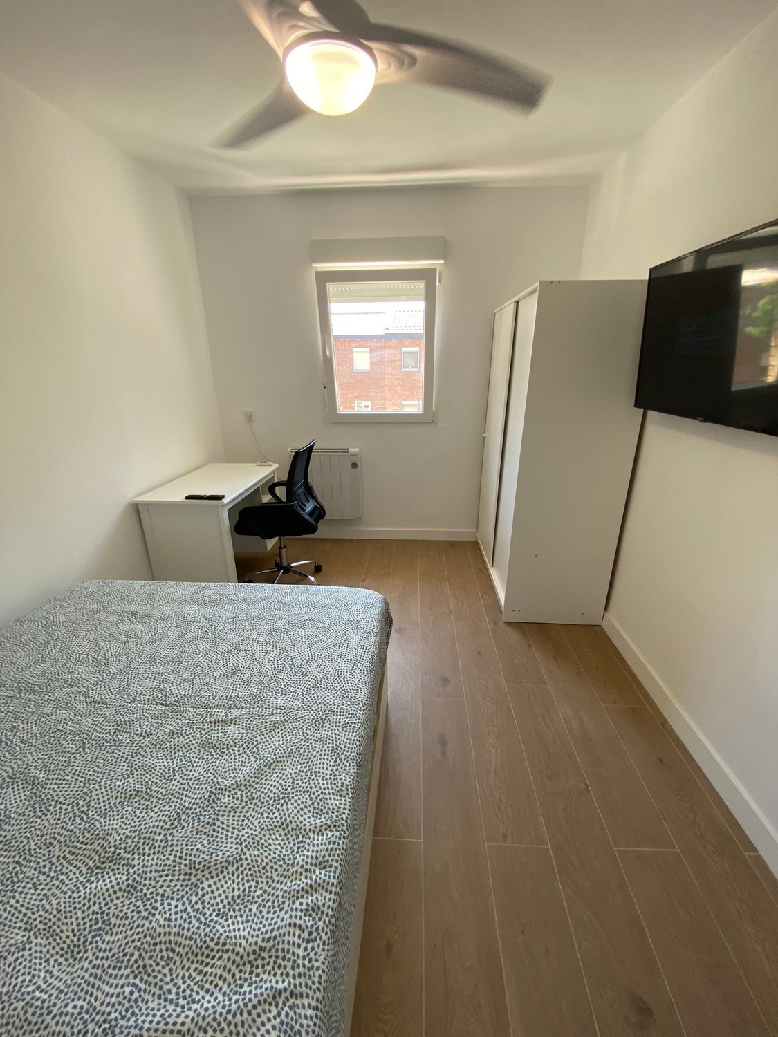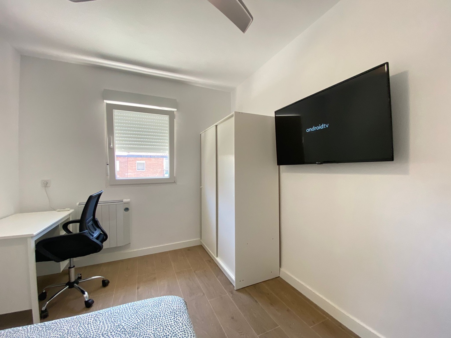 ¡Bienvenidos a la casa de estudiantes “Villaverde” ¡Estupenda habitación privada en alojamiento de estudiantes reformado en 2023, a estrenar! Alquilamos esta habitación privada, perfectamente acondicionada y con iluminación natural, con una superficie aproximada de 12m2. Cuenta con un escritorio cómodo con flexo, un televisor con Smart tv, una silla de conferencia. El mobiliario se completa con un armario de 1,55m —en cuyo interior incluye una barra para las perchas— ventilador de techo con mando a distancia y calefacción por eléctrica, la cama de ancho 1,35 m canapé abatible.