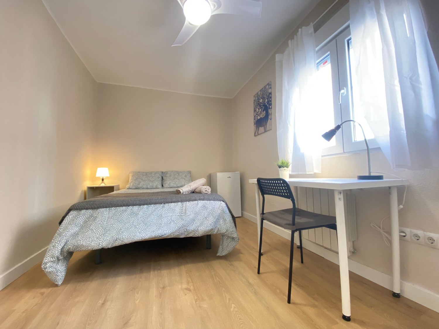 La habitación es luminosa y está perfectamente equipada, con los siguientes complementos: 1 cama de 1,35 m con almohadas, juego de sábanas y edredón, mesita de noche con lampara, armario, escritorio con silla, nevera propia y calefacción por gas natural