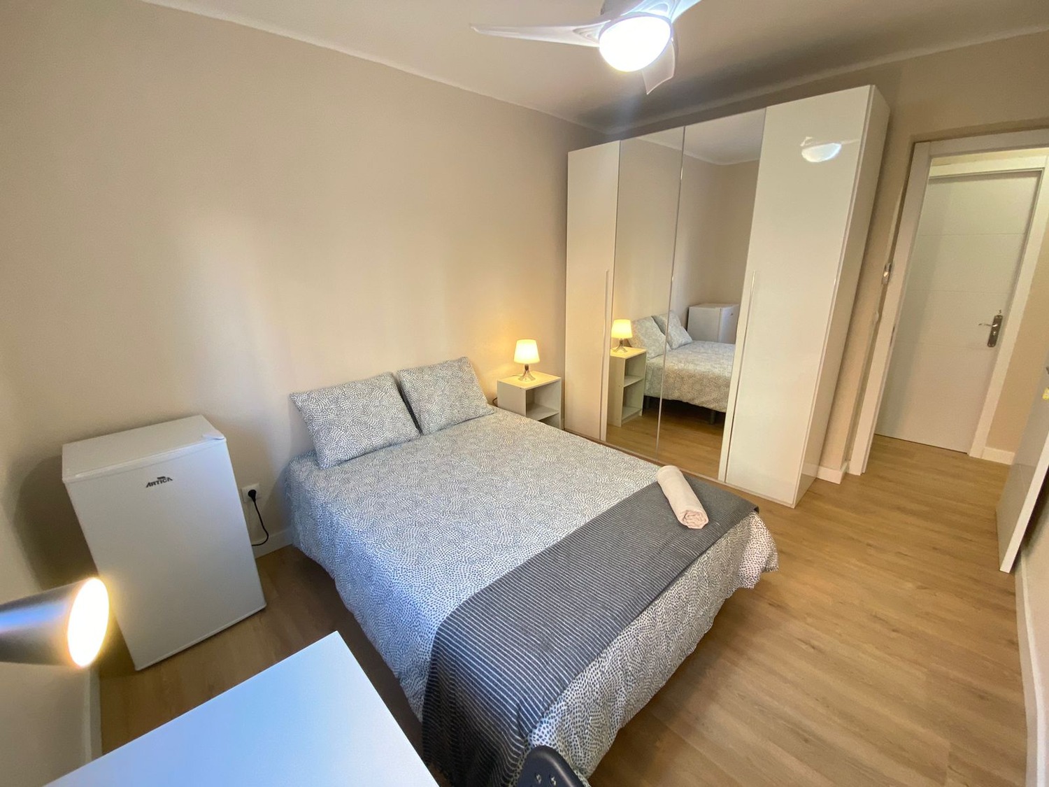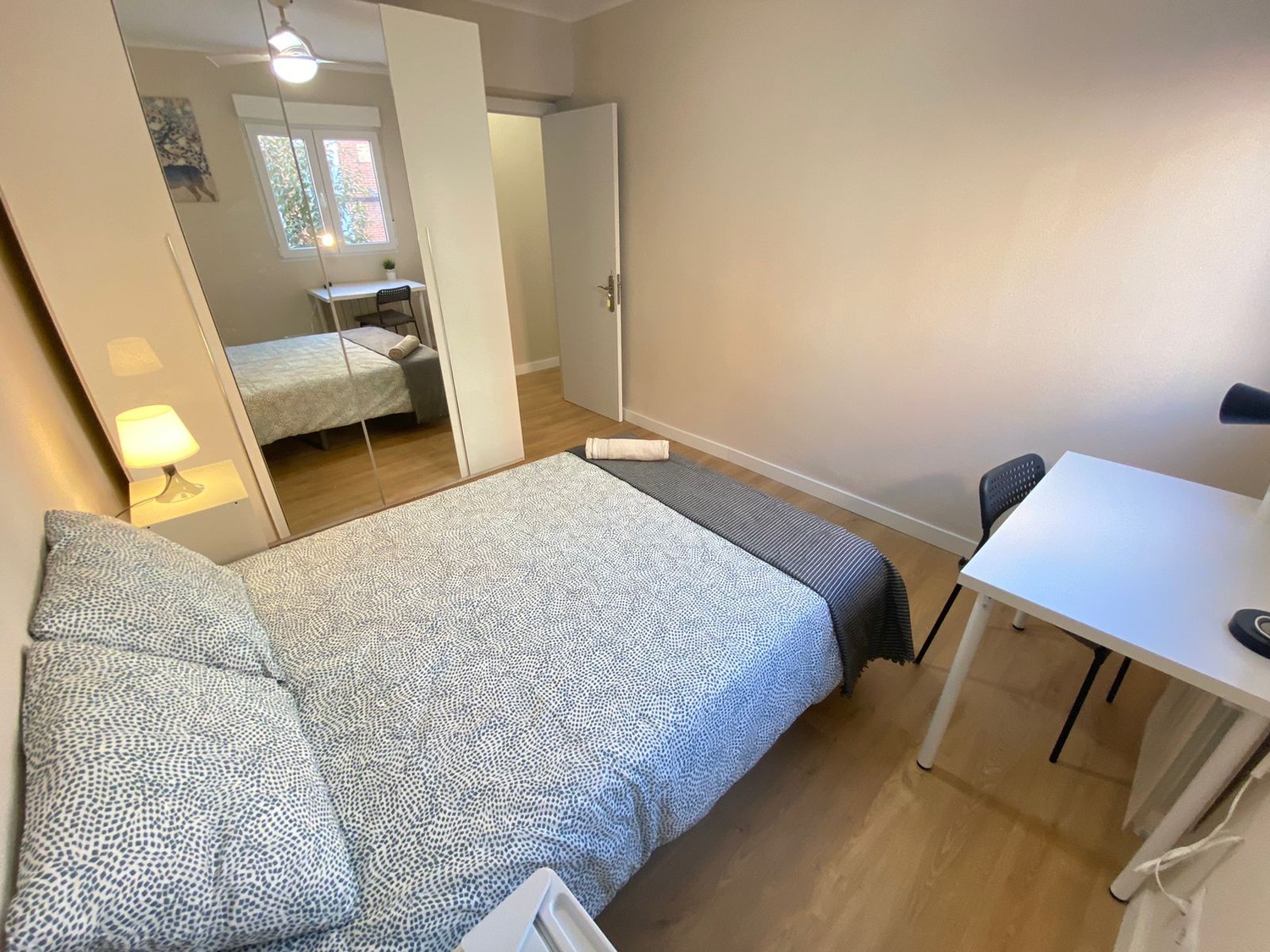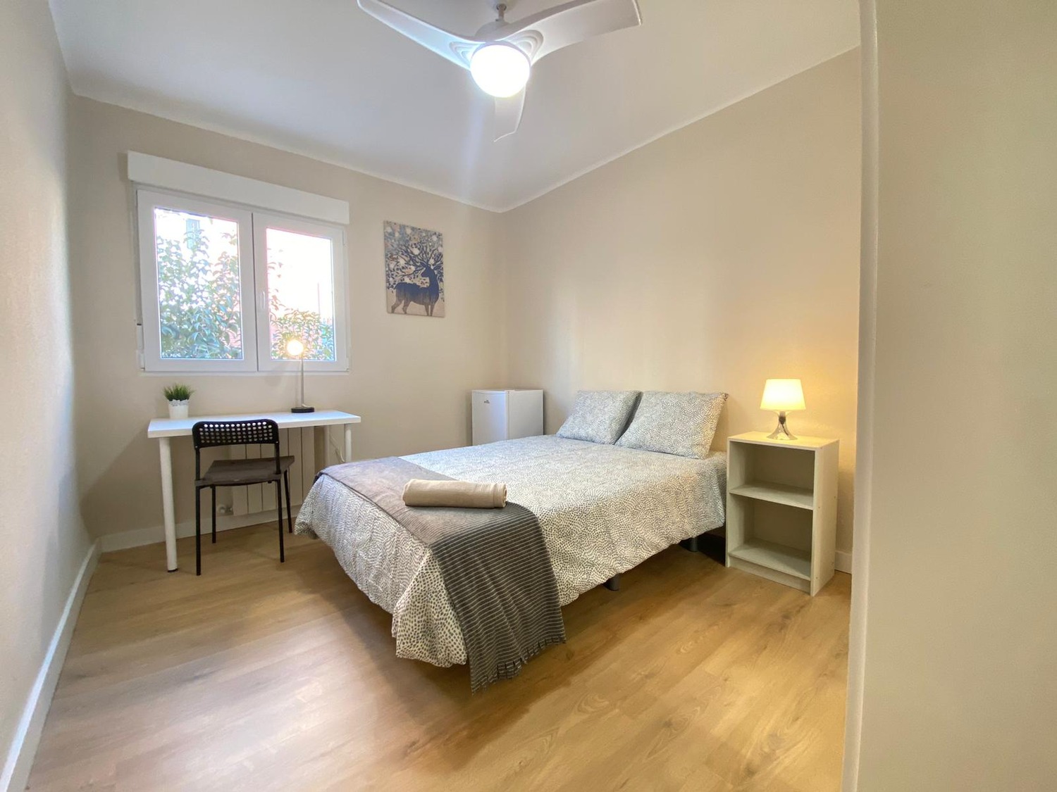 La habitación es luminosa y está perfectamente equipada, con los siguientes complementos: 1 cama de 1,35 m con almohadas, juego de sábanas y edredón, mesita de noche con lampara, armario, escritorio con silla, nevera propia y calefacción por gas natural