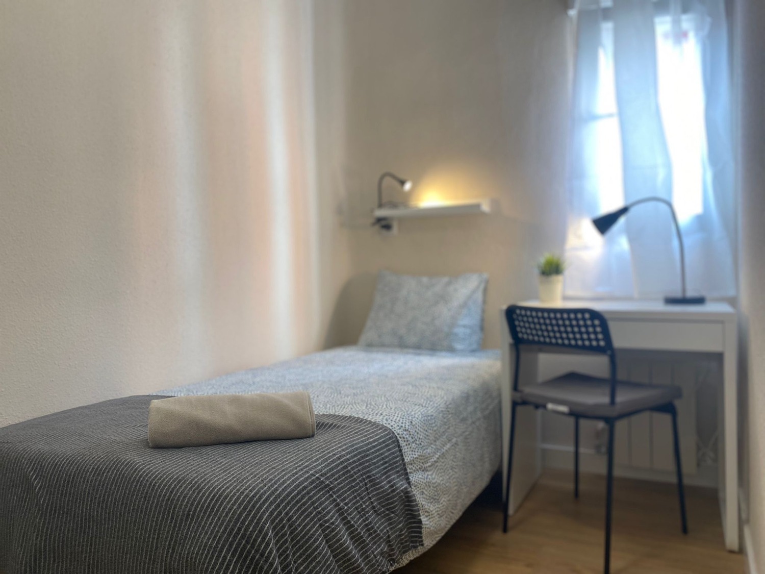 La habitación es luminosa y está perfectamente equipada, con los siguientes complementos: 1 cama de 0,90 m con almohada, juego de sábanas y edredón, armario, estantería con lampara, escritorio con silla y calefacción por gas natural.
