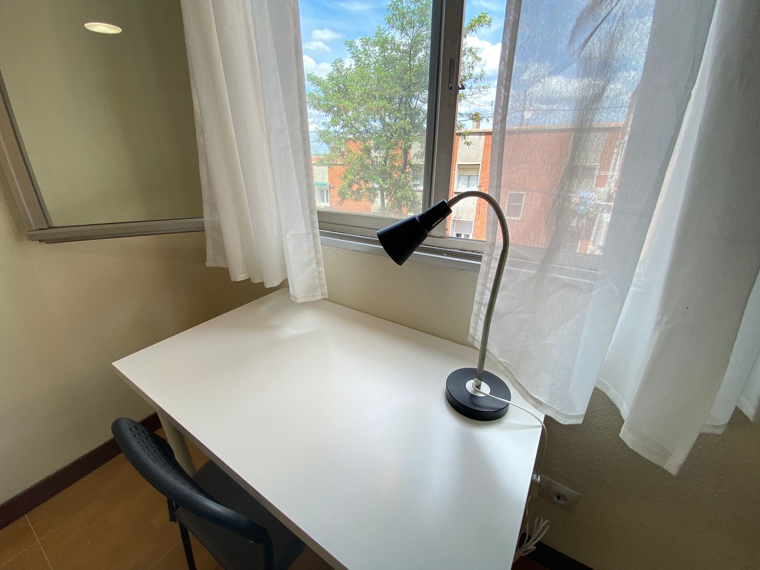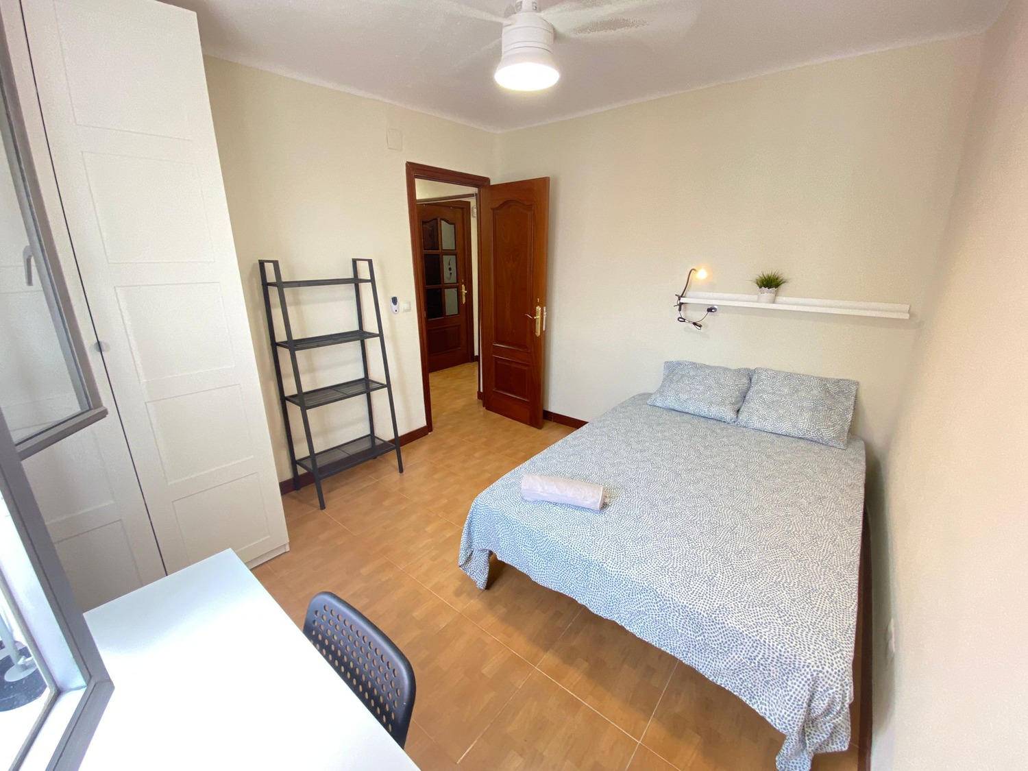La habitación es luminosa y está perfectamente equipada, con los siguientes complementos: 1 cama de 1,05 m con almohada, juego de sábanas y edredón, mesita de noche con lámpara, armario, estantería, escritorio con silla y calefacción por gas natural.