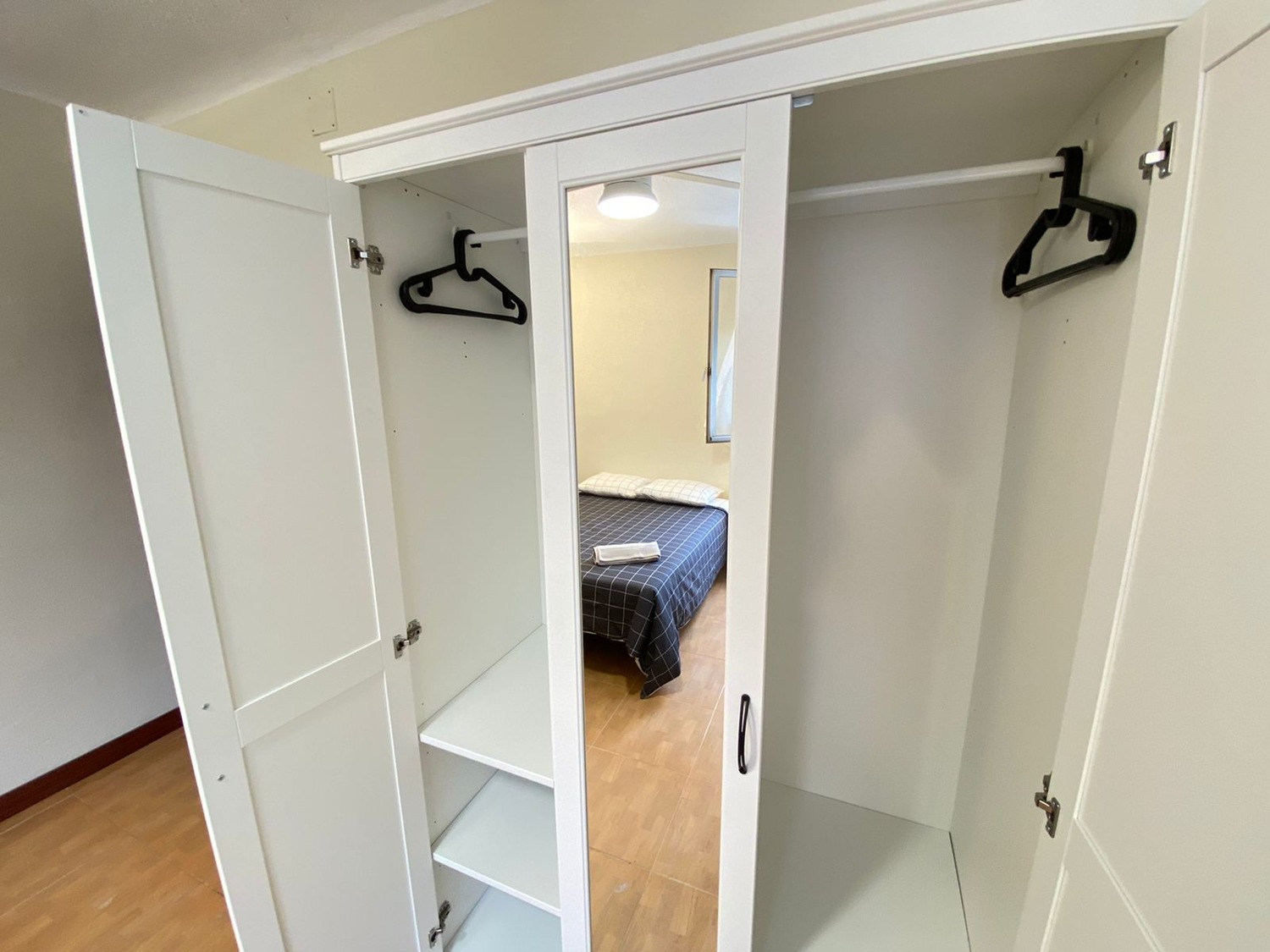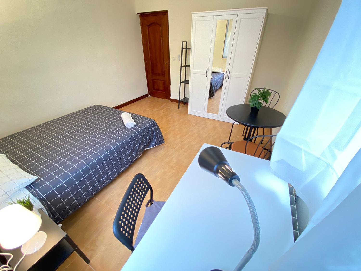 La habitación es luminosa y está perfectamente equipada, con los siguientes complementos: 1 cama de 1.35 m con dos almohadas, juego de sábanas y edredón, dos mesitas de noche con lámpara, armario, estantería, escritorio con silla, nevera individual y calefacción por gas natural.