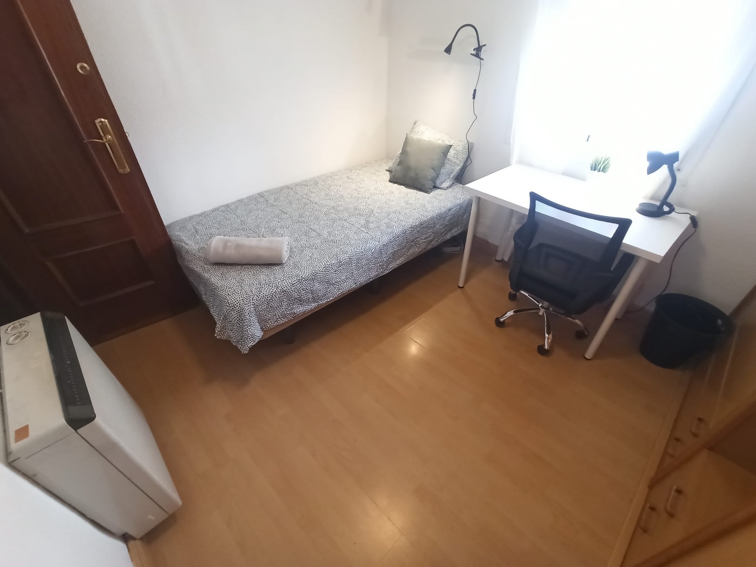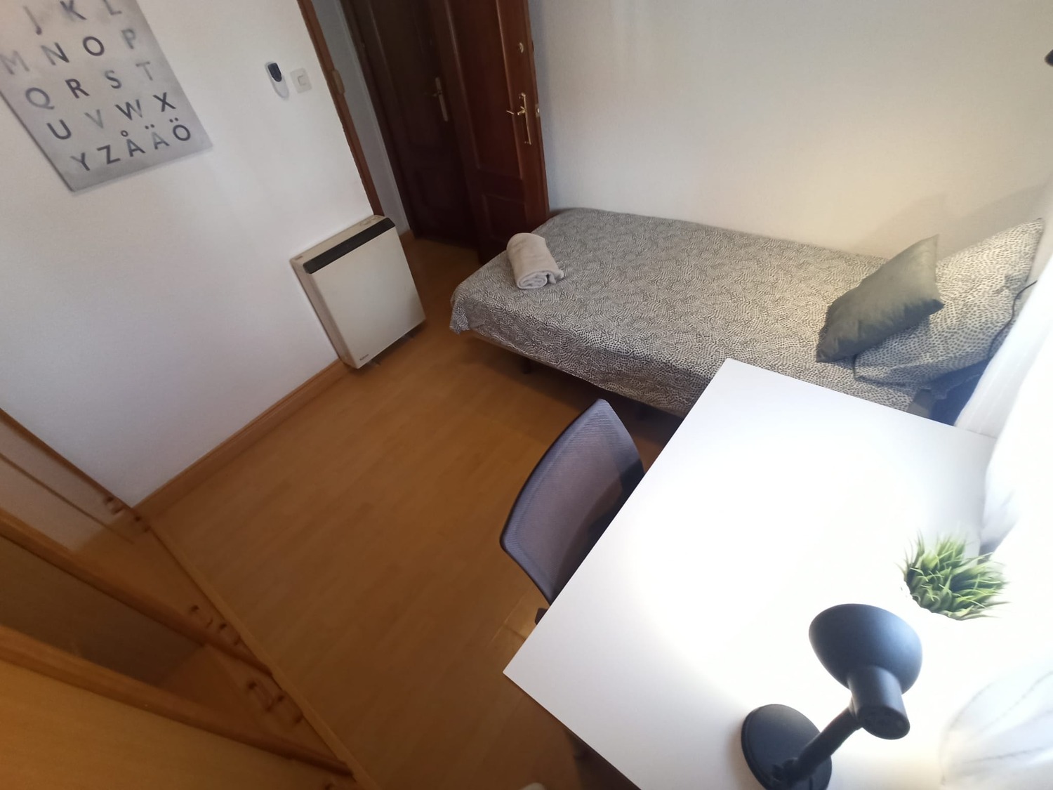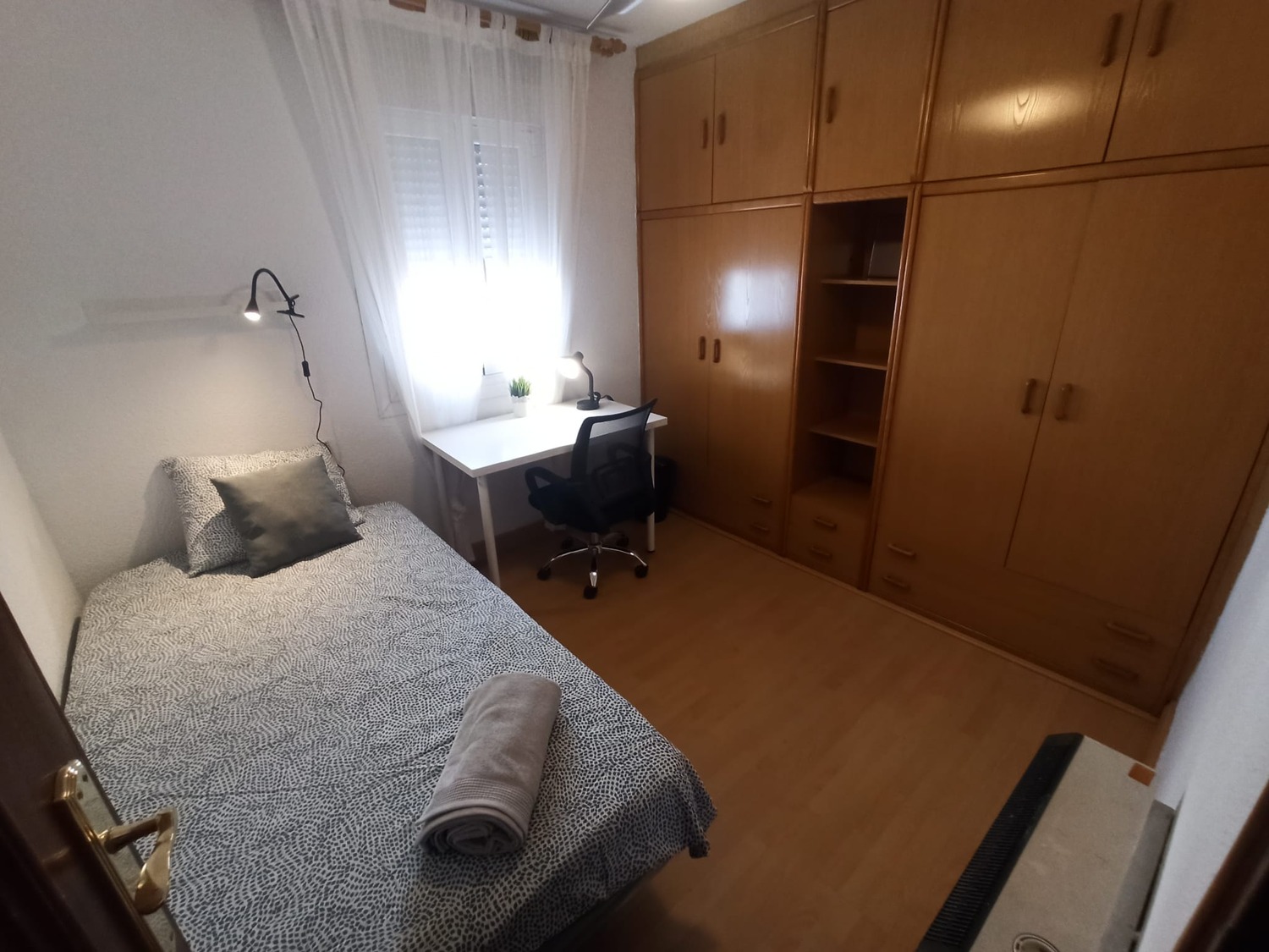 La habitación es muy luminosa y está perfectamente equipada, con los siguientes complementos: 1 cama de 1.05 cm con almohada, ropa de cama al completo, edredón y toallas, cuenta con 2 mesitas de noche con lámpara, armarios empotrados, calefacción por gas natural y ventilador de techo.