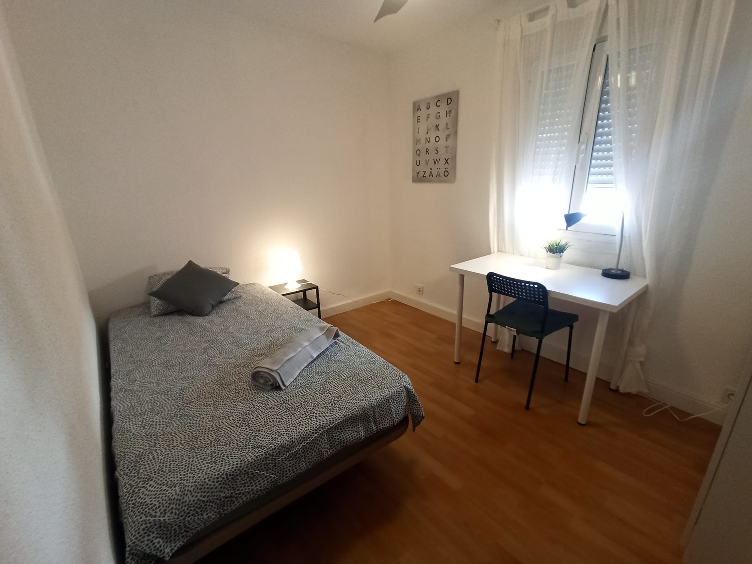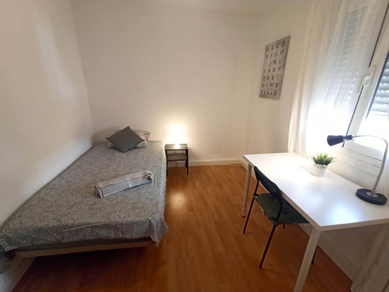 La habitación es muy luminosa y está perfectamente equipada, con los siguientes complementos: 1 cama de 1.05 cm con almohada, ropa de cama al completo, edredón y toallas, cuenta con mesita de noche con lámpara, armario y ventilador de techo.
