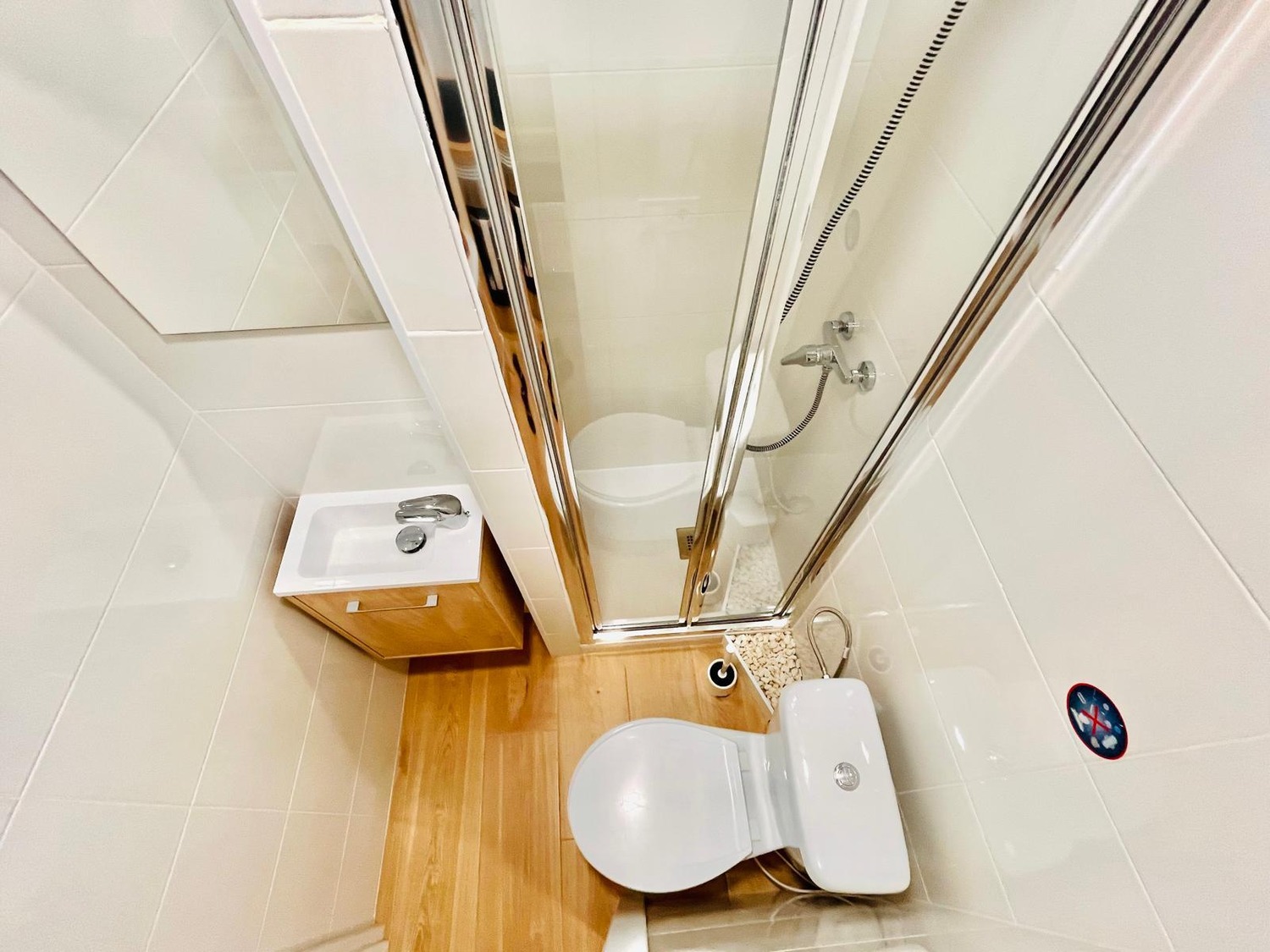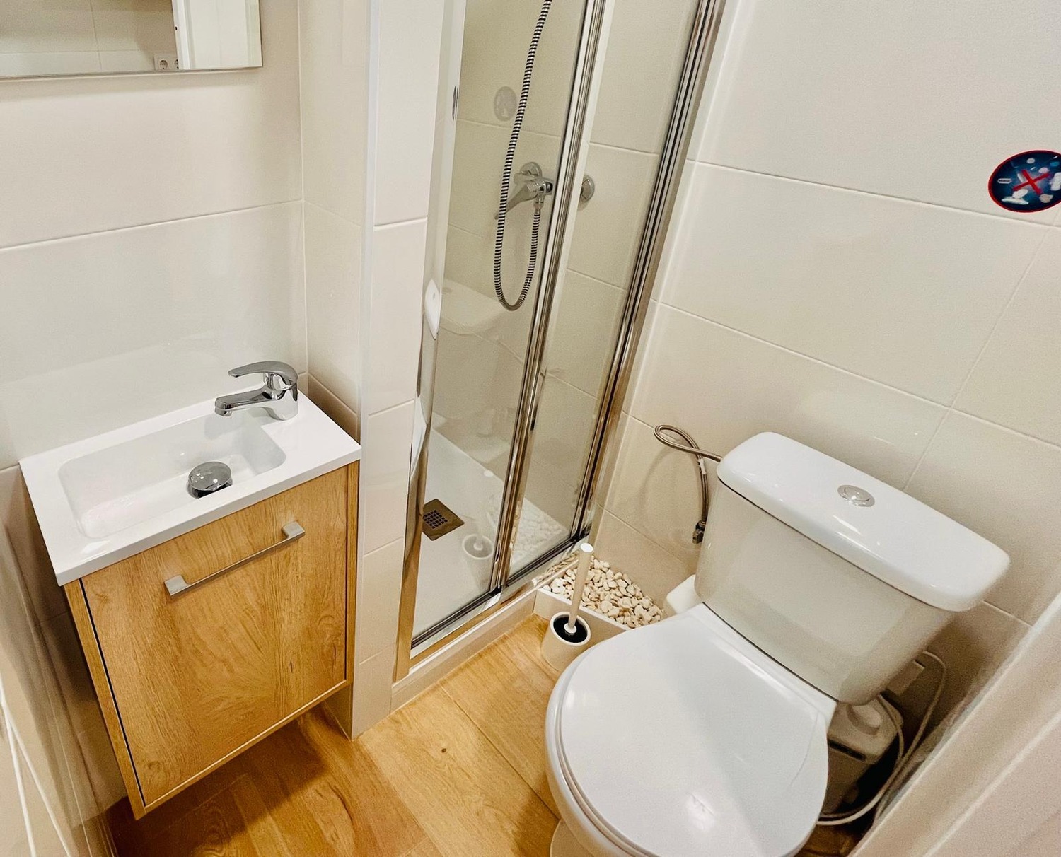 El baño está equipado con ducha, lavabo y todos los elementos esenciales para su uso diario.