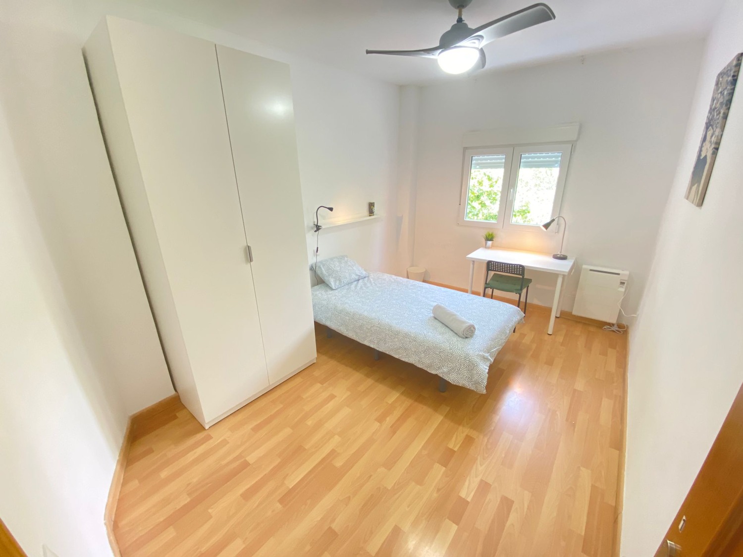 La habitación es luminosa y está perfectamente equipada, con los siguientes complementos: 1 cama de 1.05 m con almohada, juego de sábanas y edredón, 1 estante de noche con lámpara, armario, escritorio con silla, calefacción eléctrica y ventilador de techo.