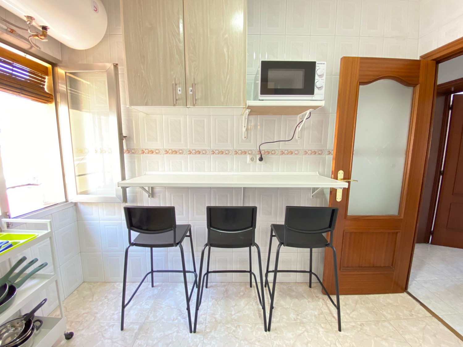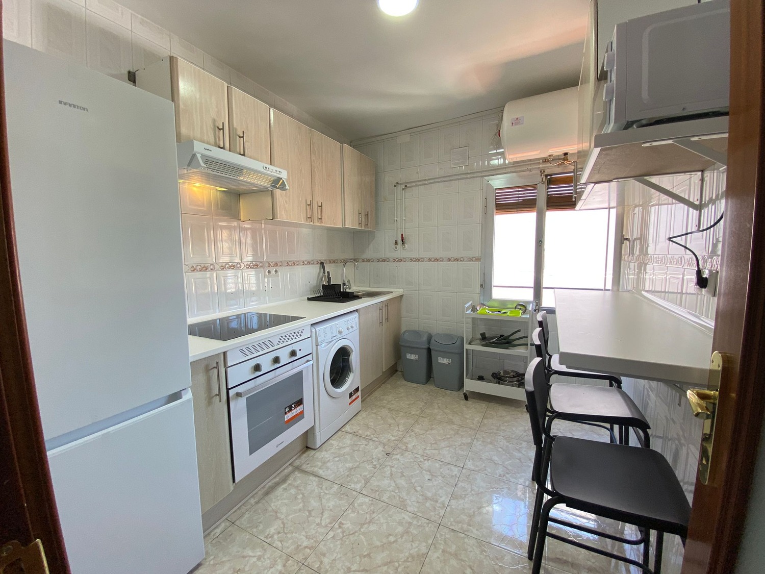En cuanto a las zonas comunes, la vivienda cuenta con una amplia cocina, amueblada y equipada con todos los electrodomésticos (frigorífico, cocina, lavadora, microondas) y el menaje necesario (cacerolas, sartenes, cubertería y cristalería). Y un baño con plato de ducha, cómodo y amplio compartido para las cuatro habitaciones.
