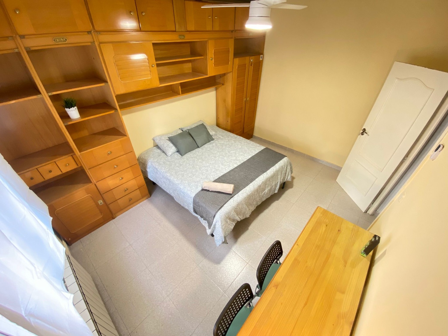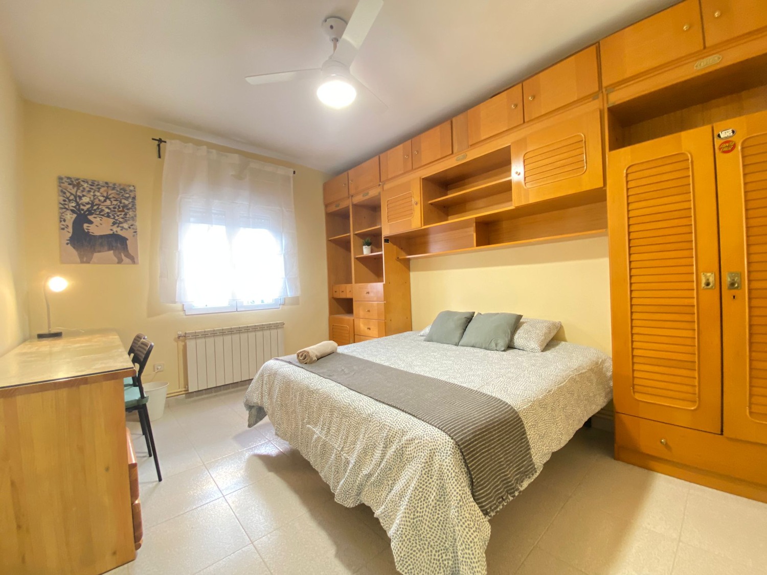 La habitación es luminosa y está perfectamente equipada, con los siguientes complementos: 1 cama de 1.60m con 2 almohadas y cojines, juego de sábanas, edredón, mesilla de noche con lámpara, un espacioso armario, calefacción por gas natural individual y cerramientos de doble cristal con las mejores calidades.