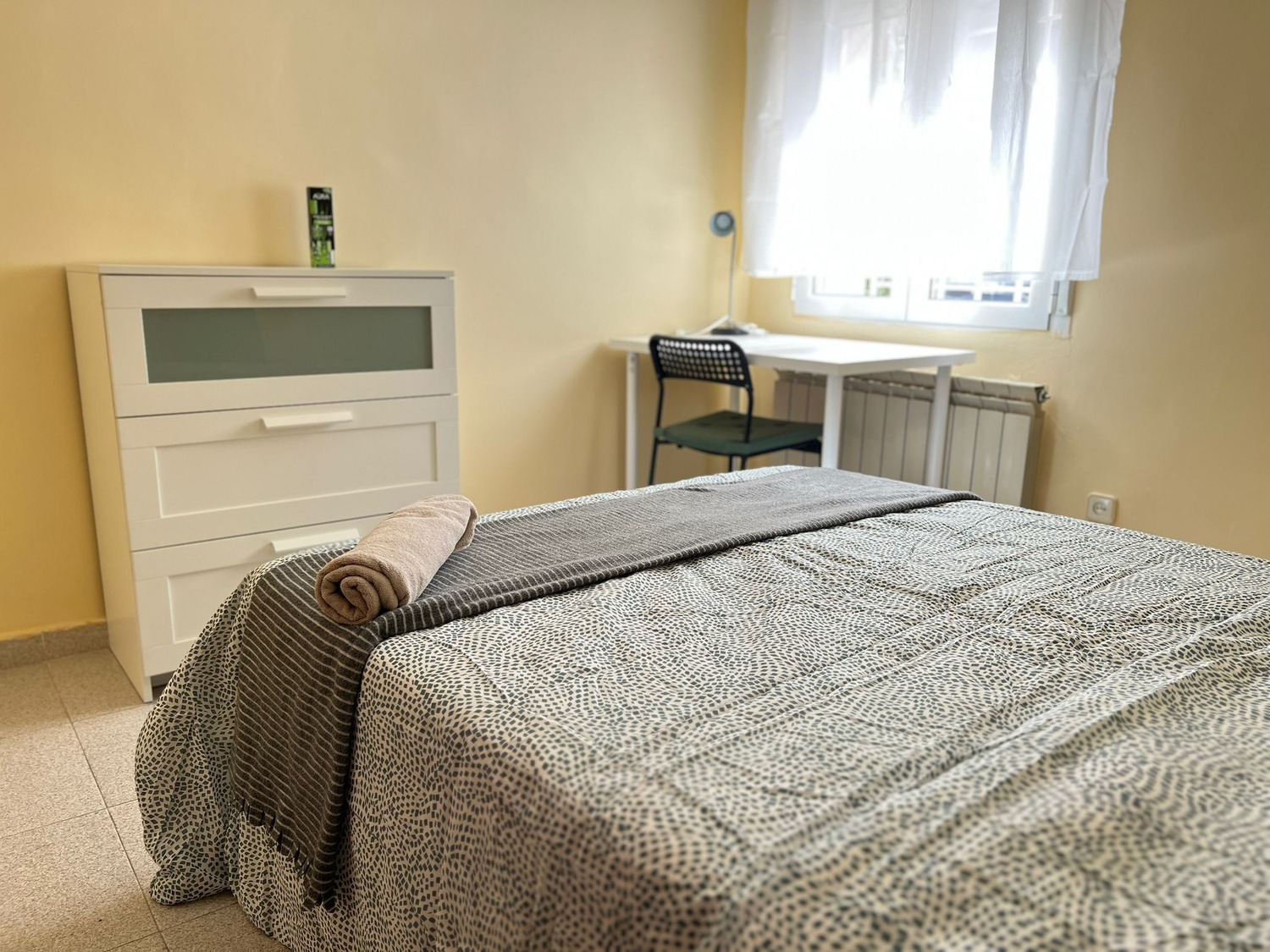 La habitación es de 14 m2 y esta perfectamente equipada con los siguientes complementos: 1 cama de 1.35 m con almohadas, juego de sábanas y edredón, armario, escritorio con lámpara, silla y calefacción eléctrica.