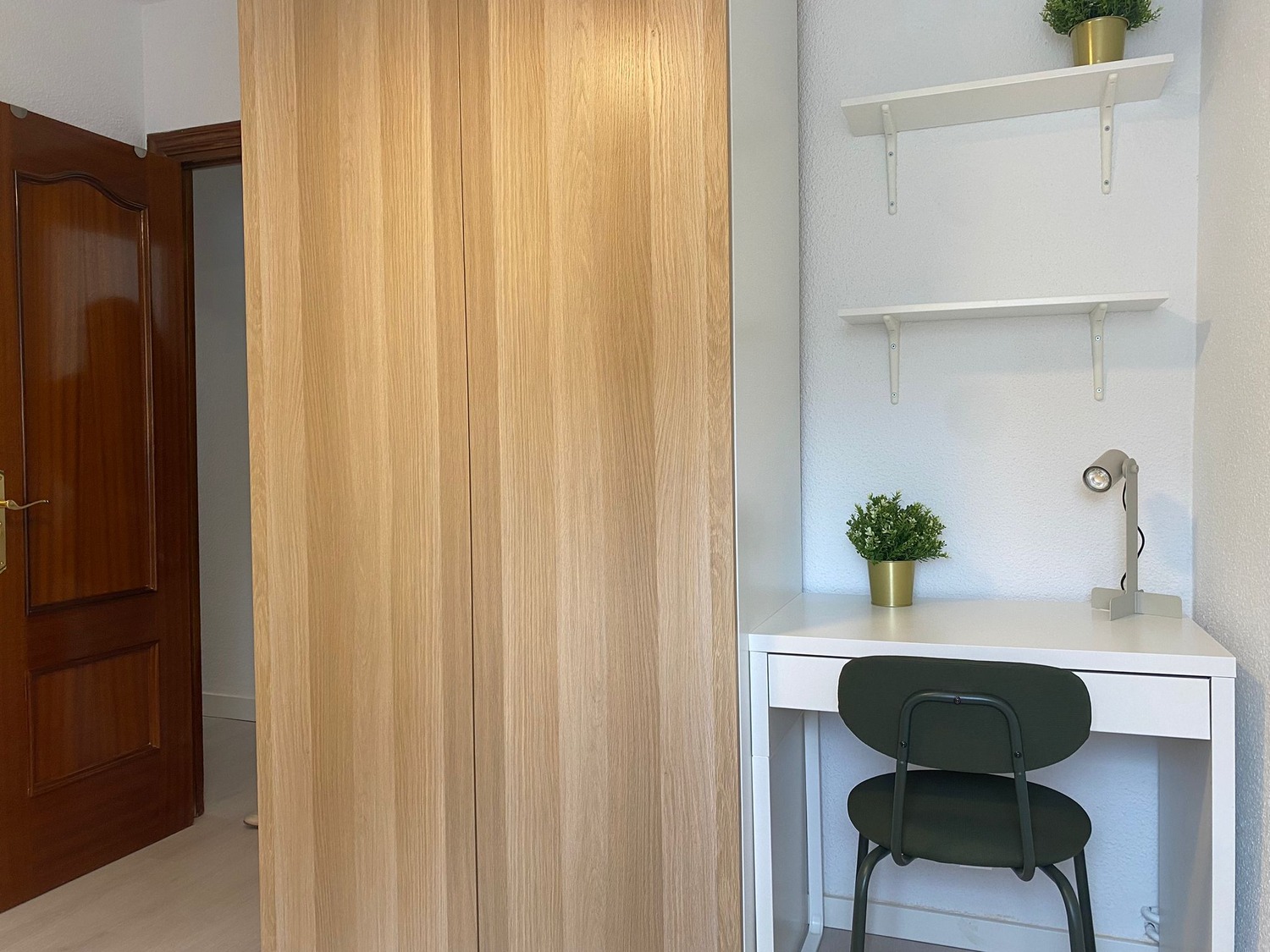 La habitacion está completamente amueblada y cuenta con cama individual, ventilador de techo para mayor confort, un amplio escritorio ideal para estudiar o trabajar, y un espacioso armario para guardar todas tus pertenencias. La habitación es exterior, lo que asegura una excelente iluminación natural durante todo el día.