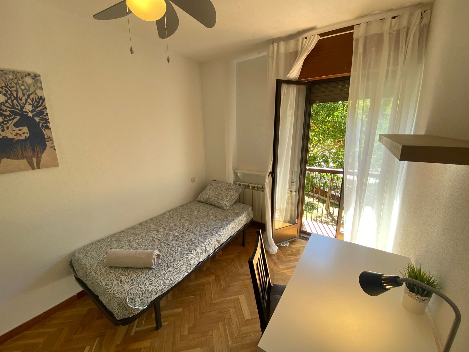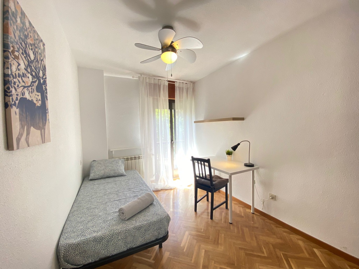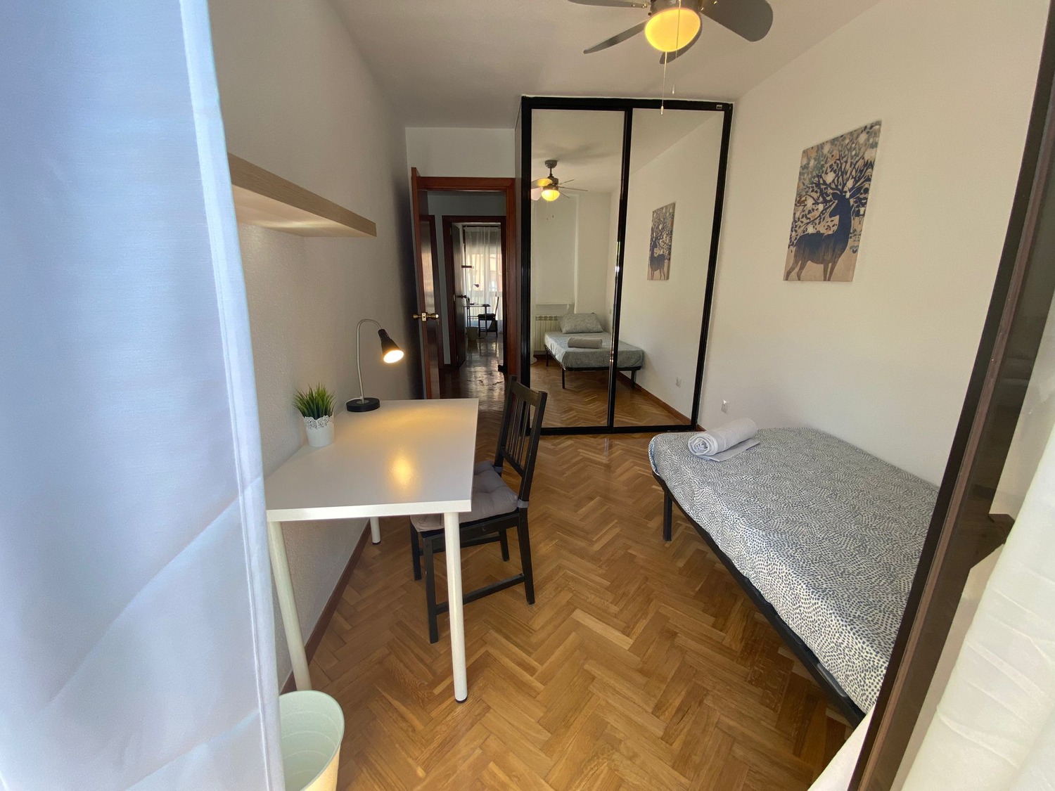 CAPITAL ROOMS alquila esta fantástica habitación individual en piso compartido, URBANIZACION CERRADA, PISCINA, PLZ GARAJE OPCIONAL, edificio Plaza de Castilla, ubicado en la Calle de Simancas 21, en Plaza Castilla, una de las zonas más seguras de Madrid y concurridas, muy bien comunicada (a 4 minutos de Metro Moncloa — línea 6, paseo de la Castellana, varias líneas de autobuses, un barrio dotado de todos los servicios, frente a los juzgados de Madrid, a la Escuela Profesional IEM, cerca de supermercados, una comisaría de Policía, bares, restaurantes y con todo tipo de servicios de la zona norte de Madrid. La habitación es EXTERIOR, luminosa y perfectamente equipada, con los siguientes complementos: 1 cama de 0,90m con almohadas, juego de sábanas y edredón, escritorio con silla y lampara, un espacioso armario doble con espejo, calefacción por gas natural individual. Todas las habitaciones incluyen cerradura con llave privada Y conexión wifi por fibra de alta velocidad. La propiedad cuenta con dos baños amplios y completos. En cuanto a las zonas comunes, la vivienda cuenta con una amplia cocina, amueblada y equipada con todos los electrodomésticos (frigorífico, cocina, lavadora, caldera/calentador eléctrico, microondas) y el menaje necesario (cacerolas, sartenes, cubertería y cristalería).