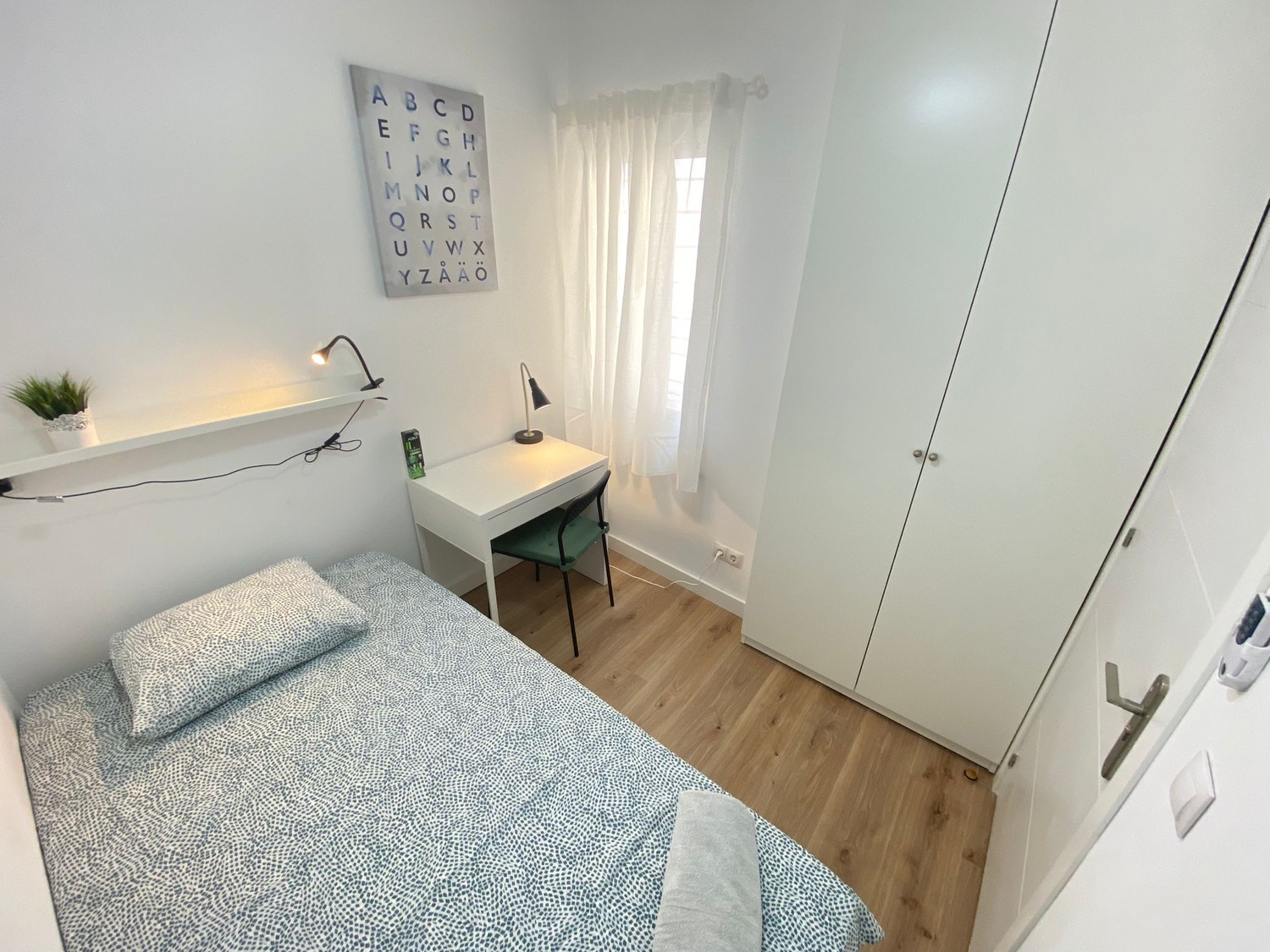 La habitación es luminosa y está perfectamente equipada, con los siguientes complementos: 1 cama de 90 cm con 1 almohada, juego de sábanas y edredón, estante con lámpara, armario, escritorio con silla, ventilador de techo.