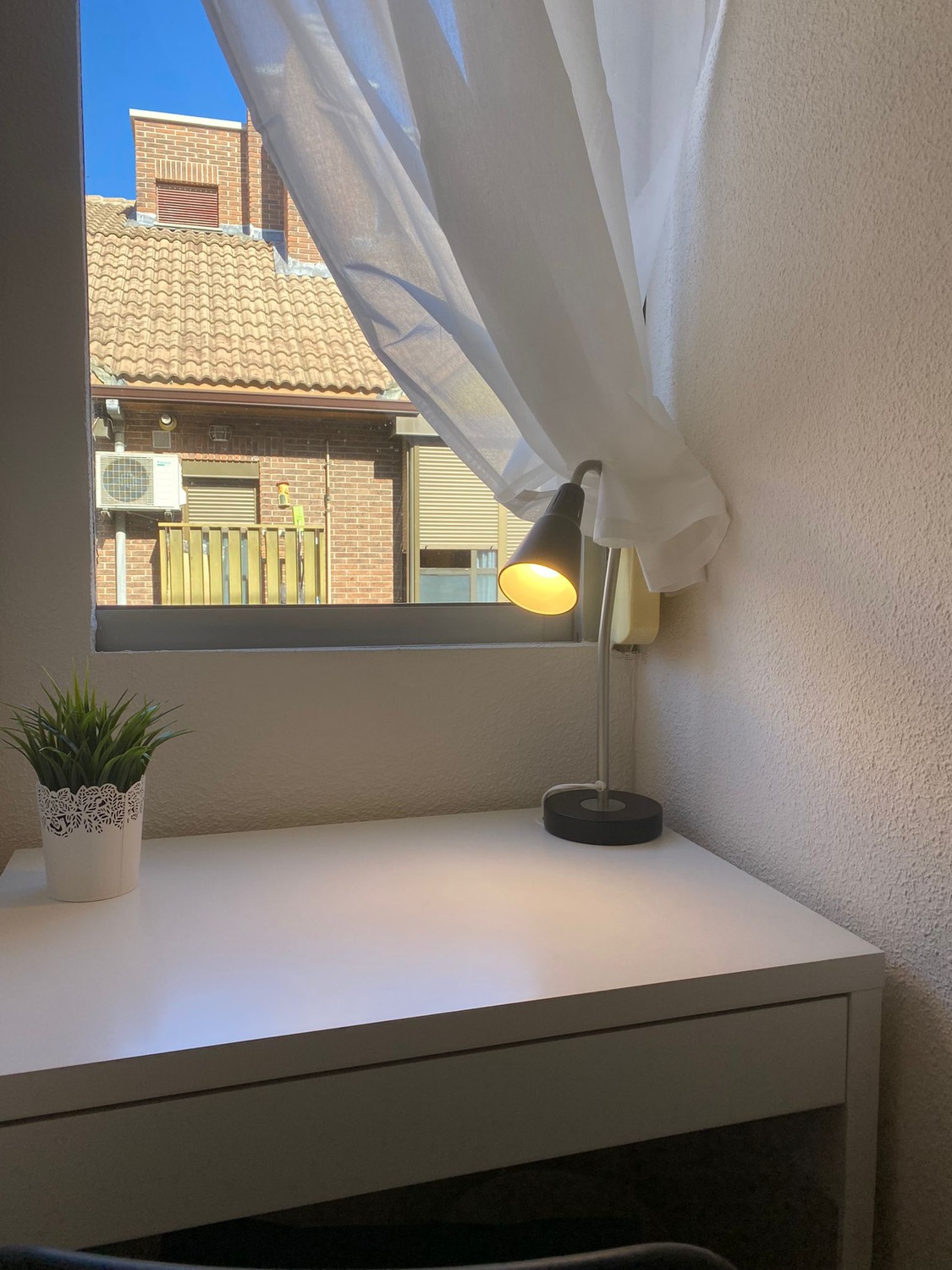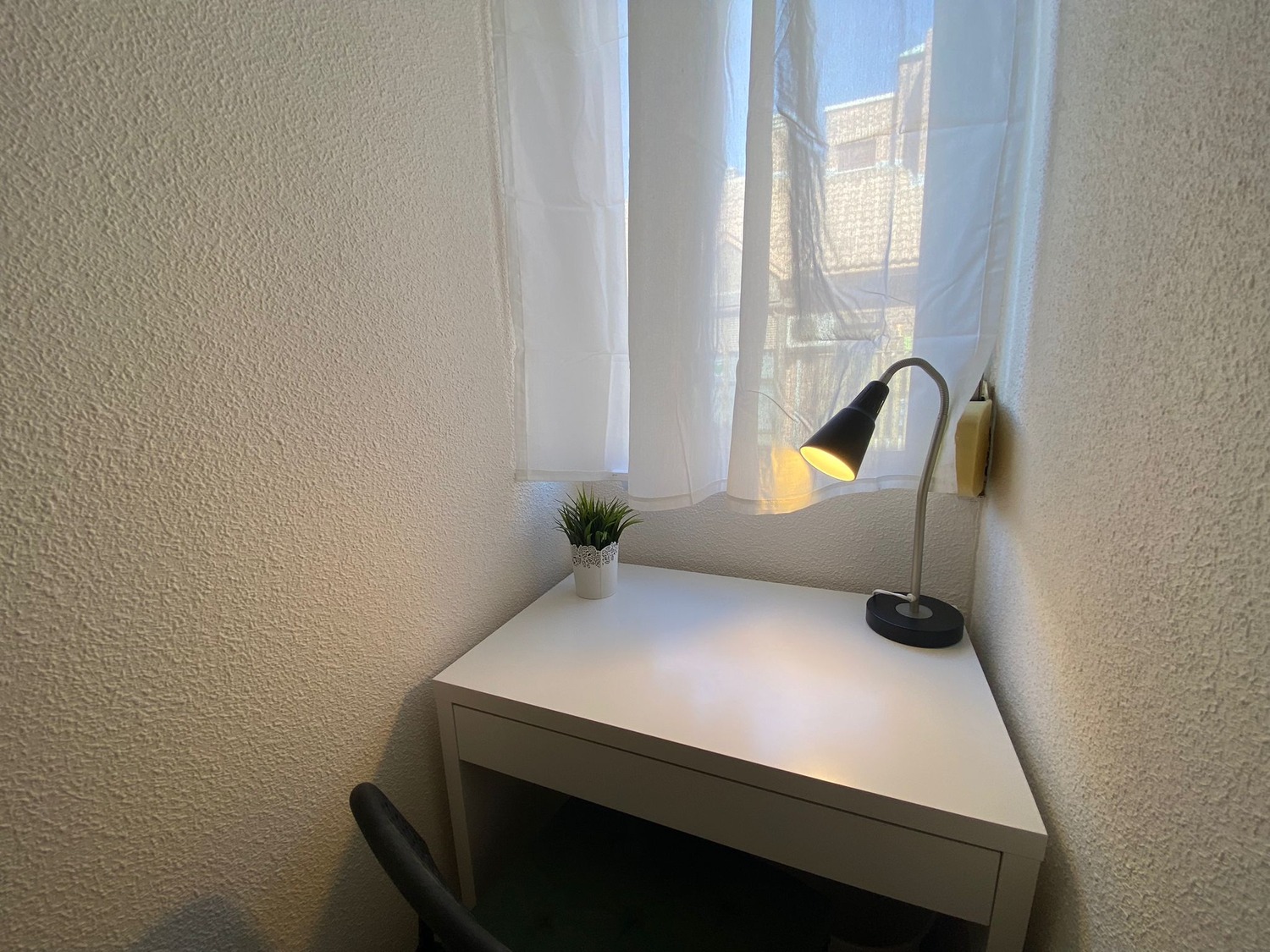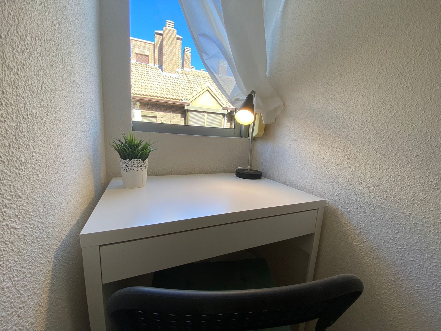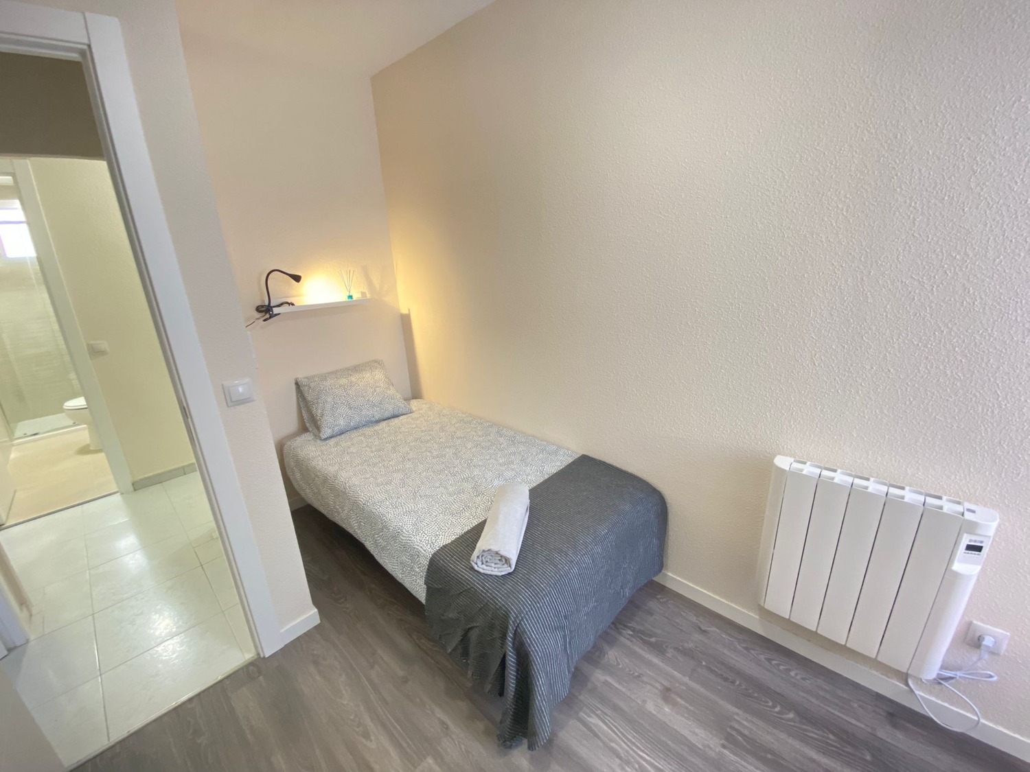 La habitación es de 8 m2, muy luminosa y perfectamente equipada con los siguientes complementos: 1 cama de 1.05 m con almohada, juego de sábanas y edredón, armario, escritorio con lámpara, silla y calefacción eléctrica.
