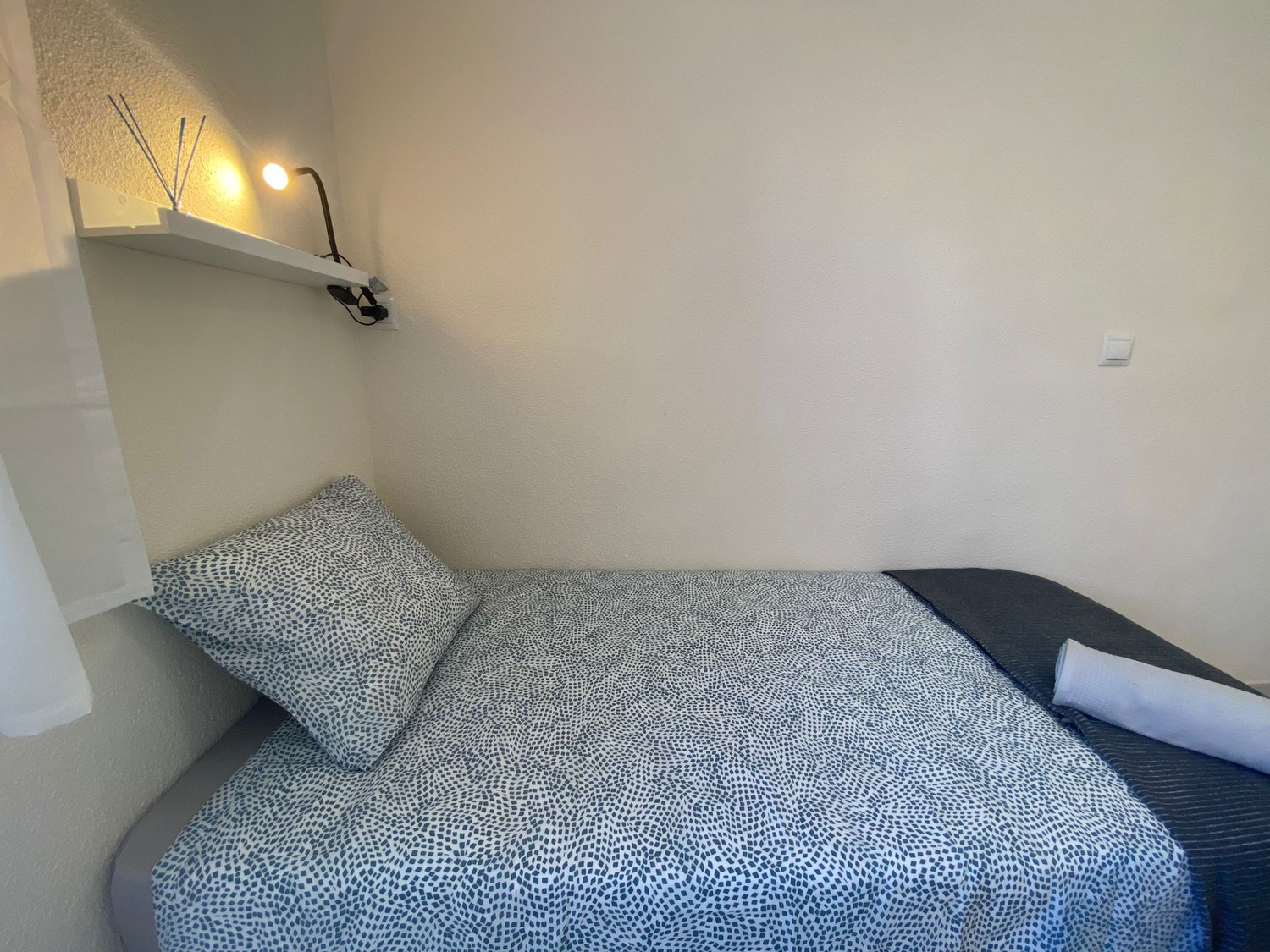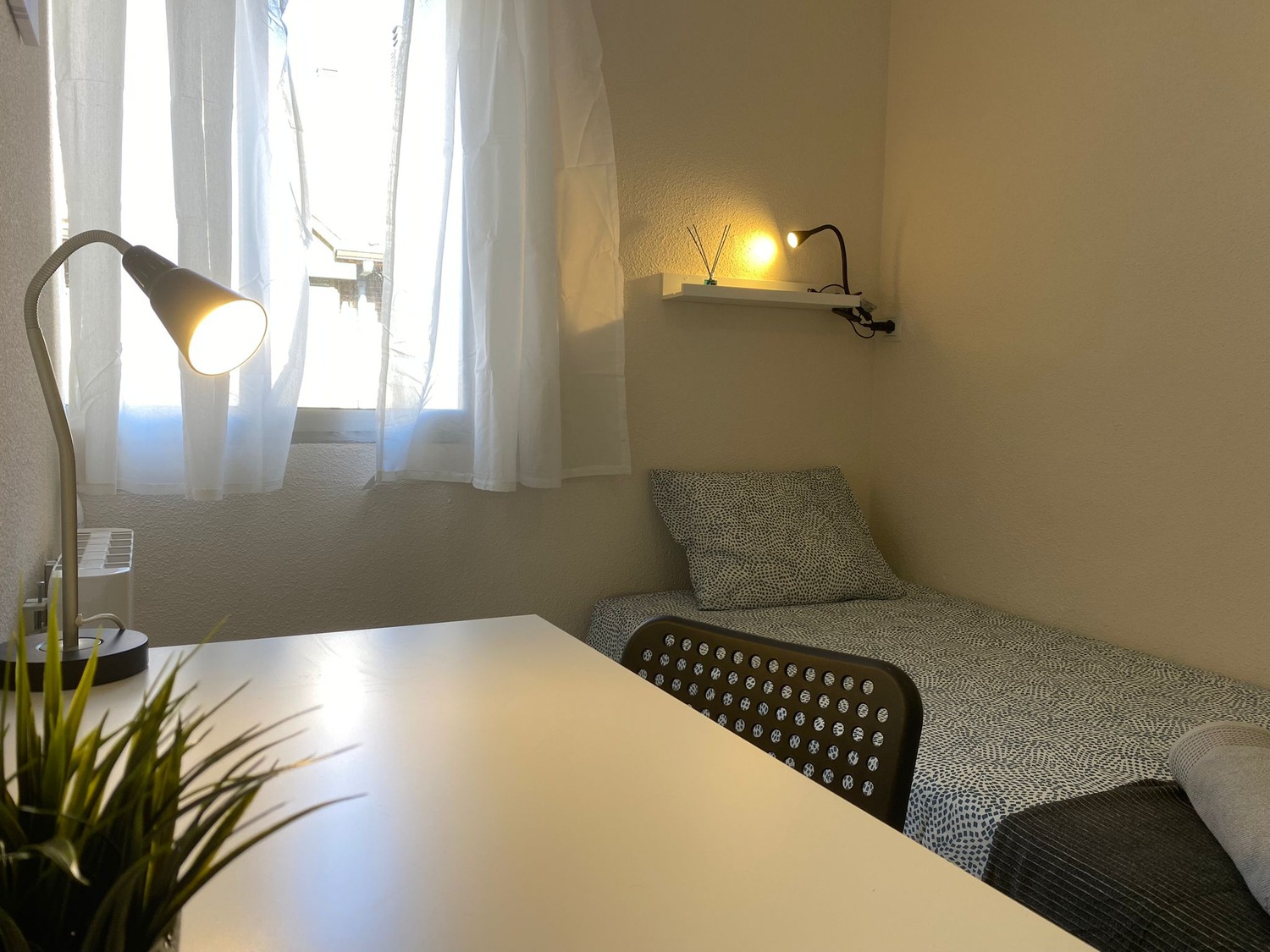 La habitación es de 8 m2, muy luminosa y perfectamente equipada con los siguientes complementos: 1 cama de 1.05 m con almohada, juego de sábanas y edredón, armario, escritorio con lámpara, silla y calefacción eléctrica.
